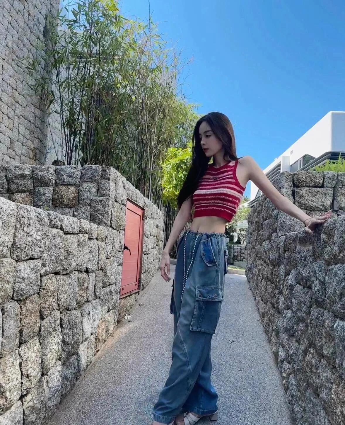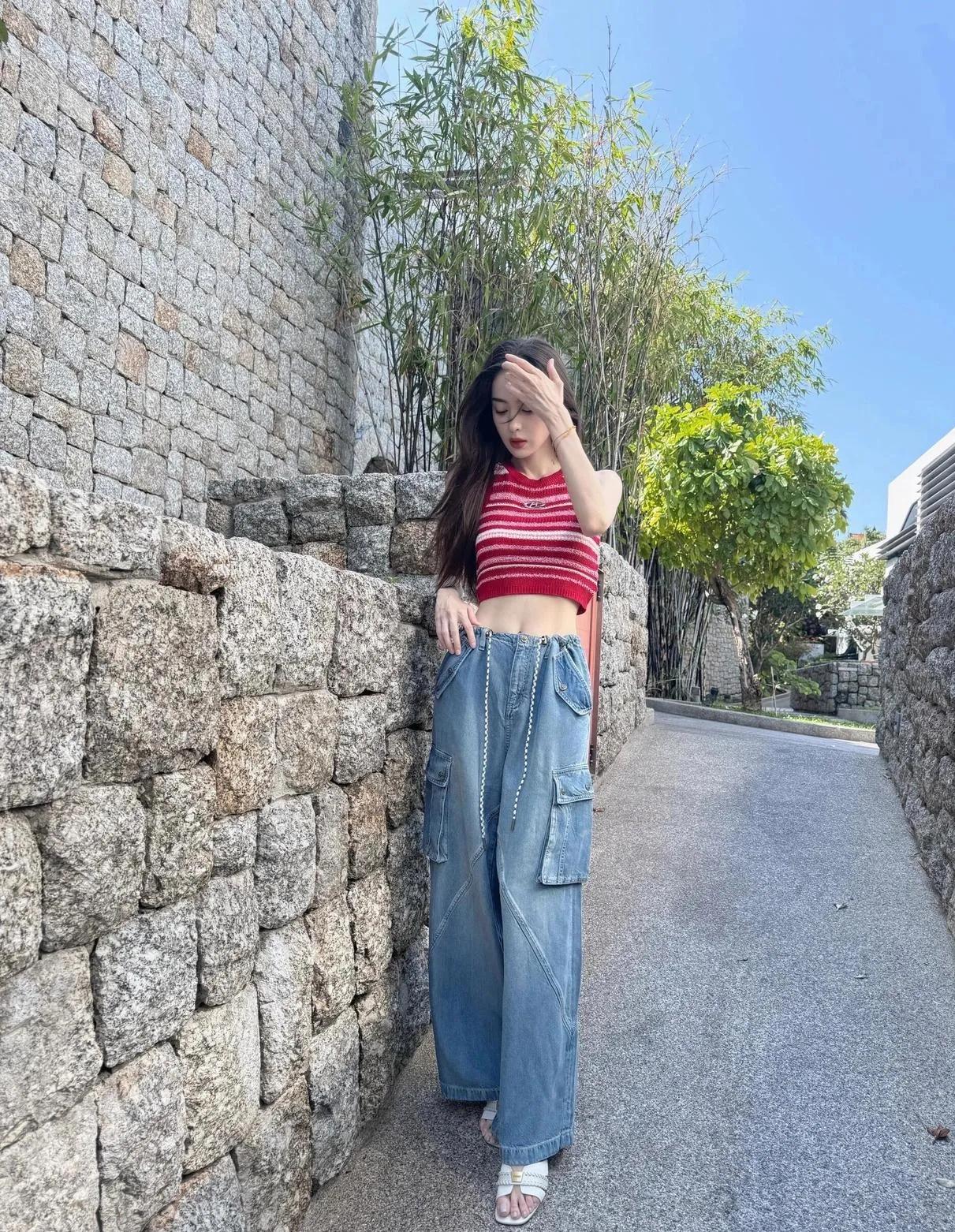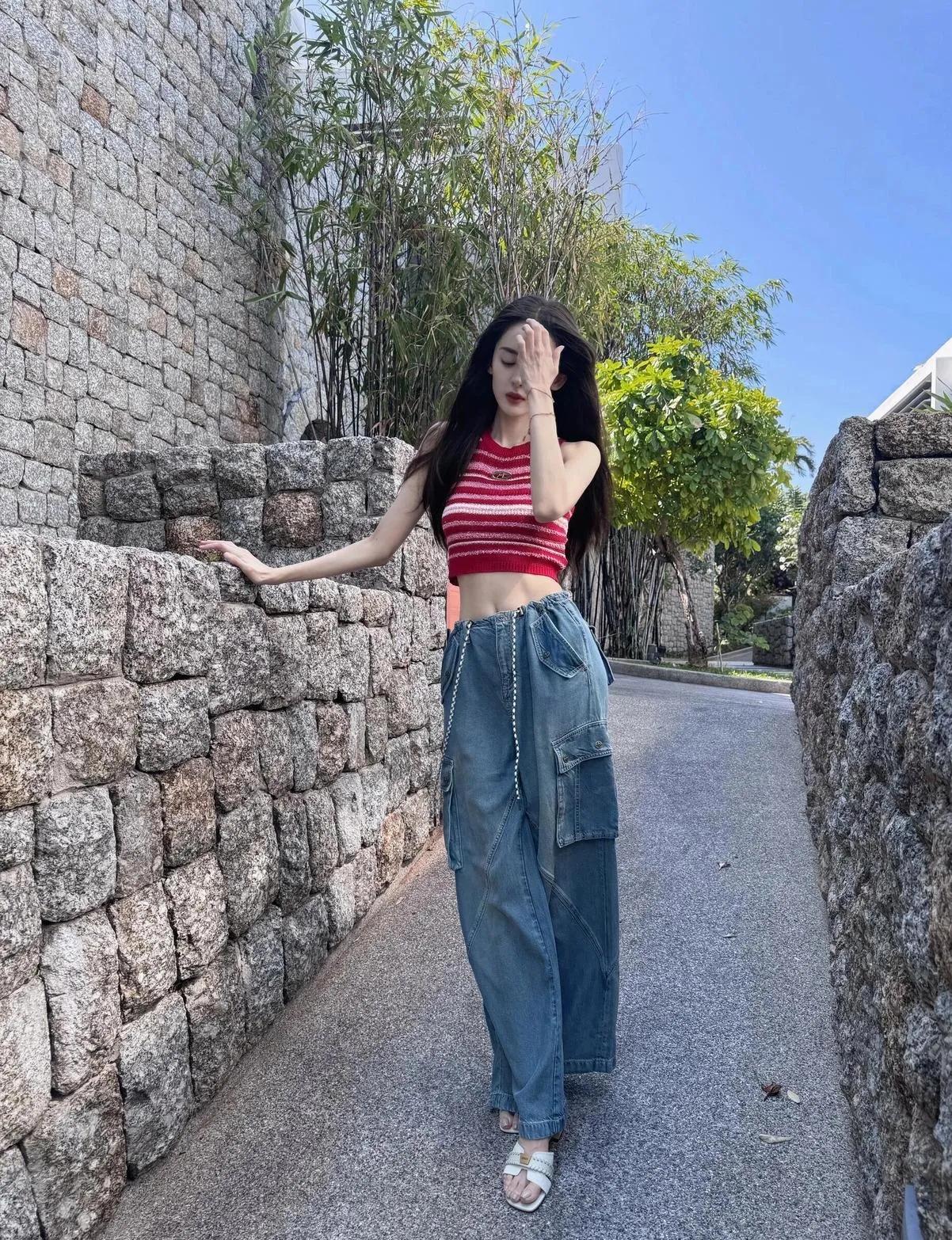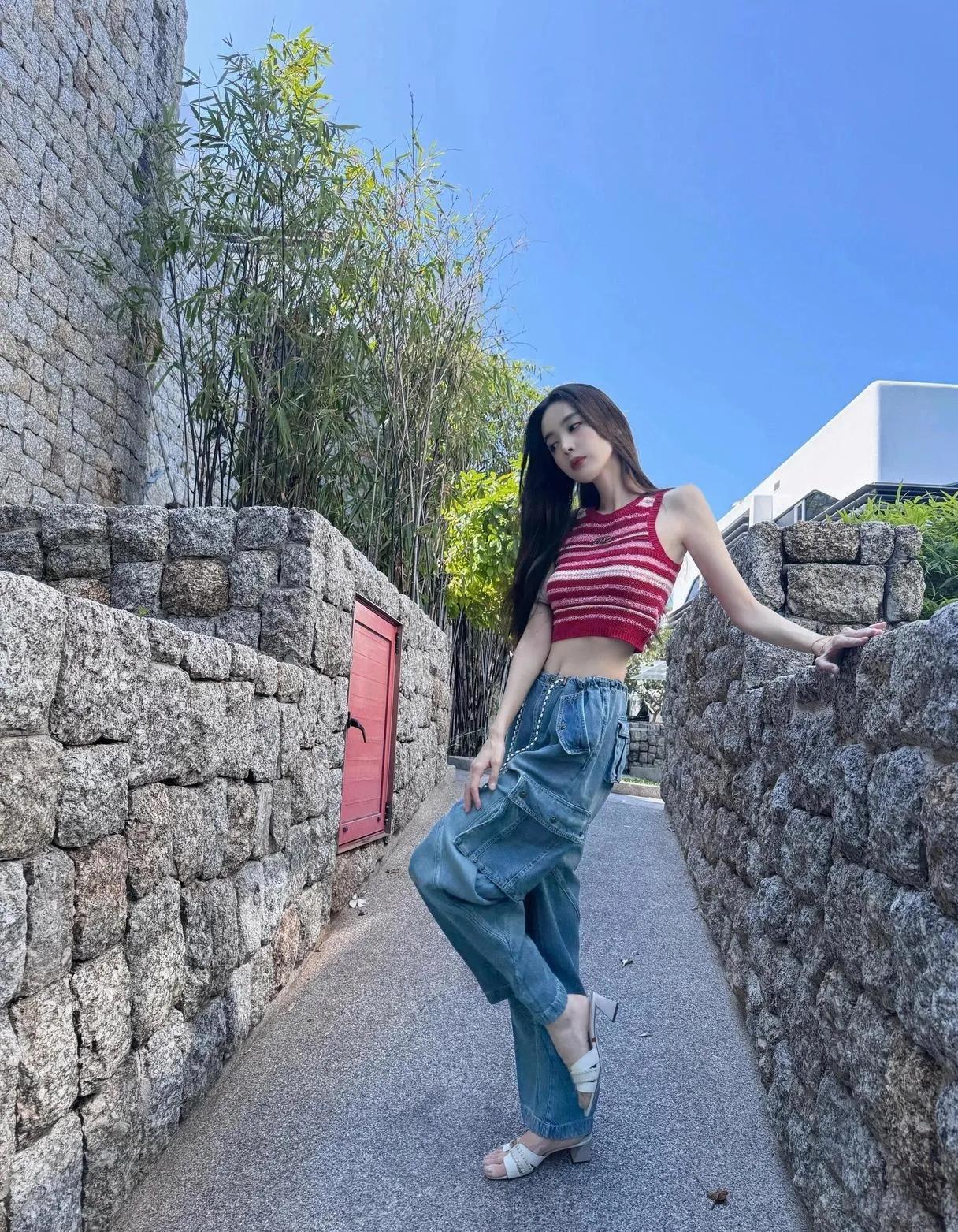 被古力娜扎的这套私服狠狠种草了!👖 红白条纹针织背心,复古又显白,短款设计还能优化身材比例。 搭配一条高腰工装牛仔裤,瞬间拉长腿部线条,对小个子也很友好。 春天想走甜酷路线的姐妹,这套可以直接抄作业! 古力娜扎同款 春季穿搭 甜酷风 短款上衣