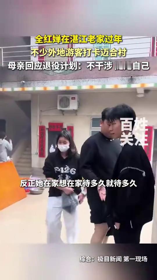 全红蝉在湛江老家过年,母亲回应退役计划:不干涉,随她自己。 极目新闻。 不少外地游客打卡迈合村。今年全红蝉回来好多次了。据媒体公开报道,跳水运动员奥运冠军全红婵今年在家乡广东湛江过春节。2月17日是农历大年初一,有网友在社交网站发布视频称,不少游客来到全红蝉家乡湛江迈合村游览。 综合:极目新闻第一现场。记者:今年过年在家她要待几天?迈合村有村干部告诉记者,村内安排了工作人员值守维持秩序。全红婵母亲:反正她什么时候出去,我不理这些东西,反正她在家想在家待多久就待多久。记者:全妹以后退役有什么计划吗?靠她自己。