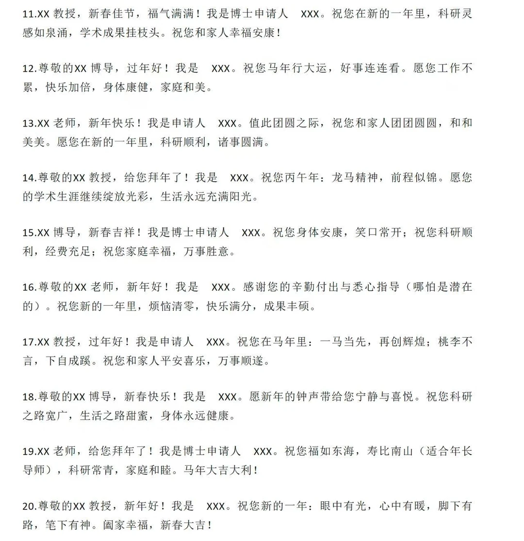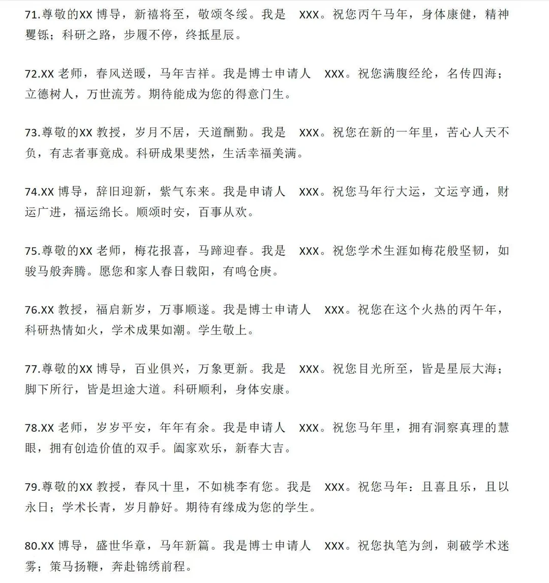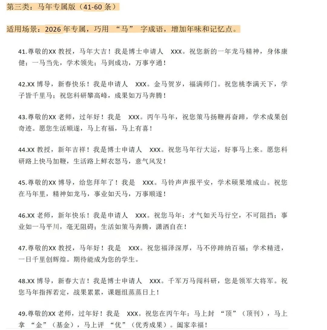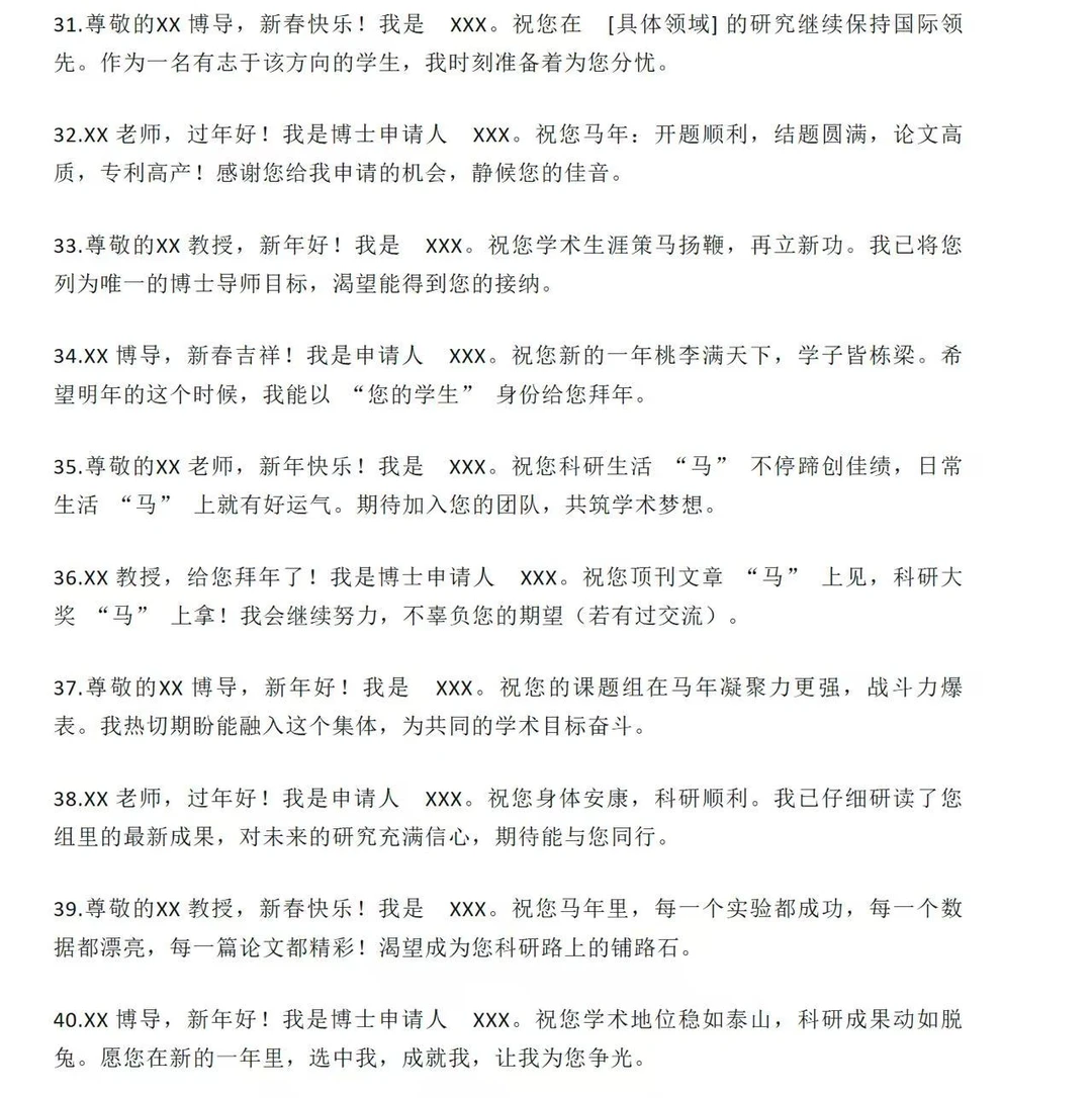 第一类:极致稳妥版(1-20 条)适用场景:首次联系、老师风格严肃、不确定老师喜好时的“安全牌”。1.尊敬的XX 教授,新年好!我是 XX 专业的博士申请人 XXX。值此丙午马年新春佳节,给您和家人拜年了!祝您新春快乐,身体健康,阖家幸福,万事顺遂!2.尊敬的XX 博导,过年好!我是申请人 XXX。感谢您在百忙之中阅读过我的申请材料。新春之际,祝您福暖四季,风禾尽起,科研之路长青,桃李满天下!3.XX 教授,新年快乐!我是博士申请人 XXX。辞旧迎新之际,祝您和家人龙马精神,岁岁平安。愿您在新的一年里工作顺利,生活美满,诸事皆宜。4.尊敬的XX 老师,给您拜年了!我是 XXX,一名渴望加入您课题组的博士申请人。祝您马年大吉,身体康健,家庭和美,在学术领域继续引领风骚。5.XX 教授,新春吉祥!我是申请人 XXX。感谢您为学术界做出的贡献,也感谢您给后辈学子的指引。祝您新的一年如意吉祥,科研硕果累累,生活喜乐安宁。6.尊敬的XX 博导,新年好!我是 XXX。值此佳节,祝您事业如日中天,成果层出不穷;祝您家人安康,福泽绵长。期待有机会得到您的指点。7.XX 老师,过年好!我是博士申请人 XXX。祝您在丙午马年:身体倍儿棒,心情倍儿好,科研顺风顺水,家庭幸福美满!