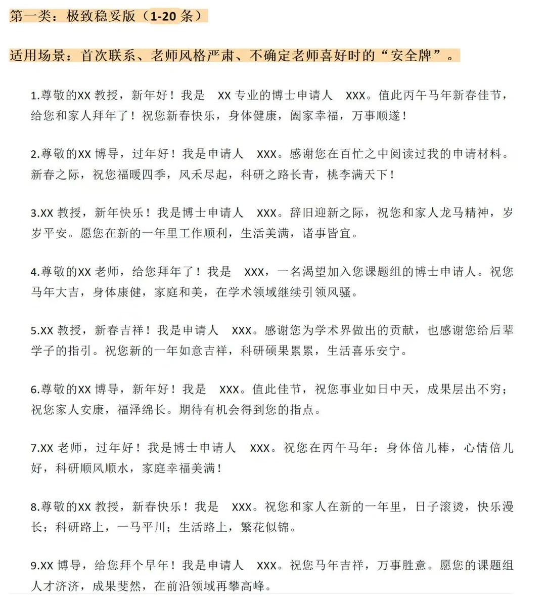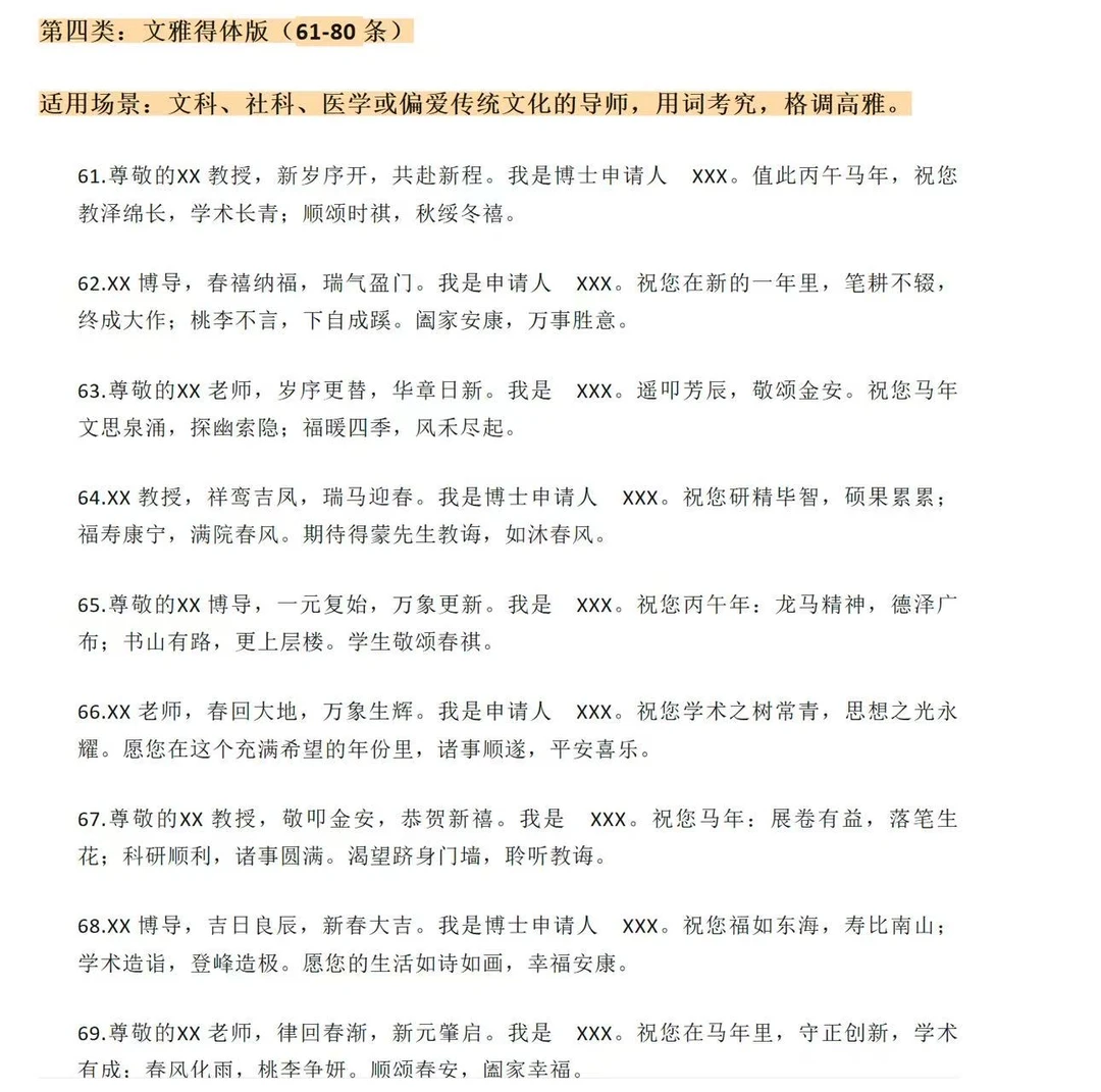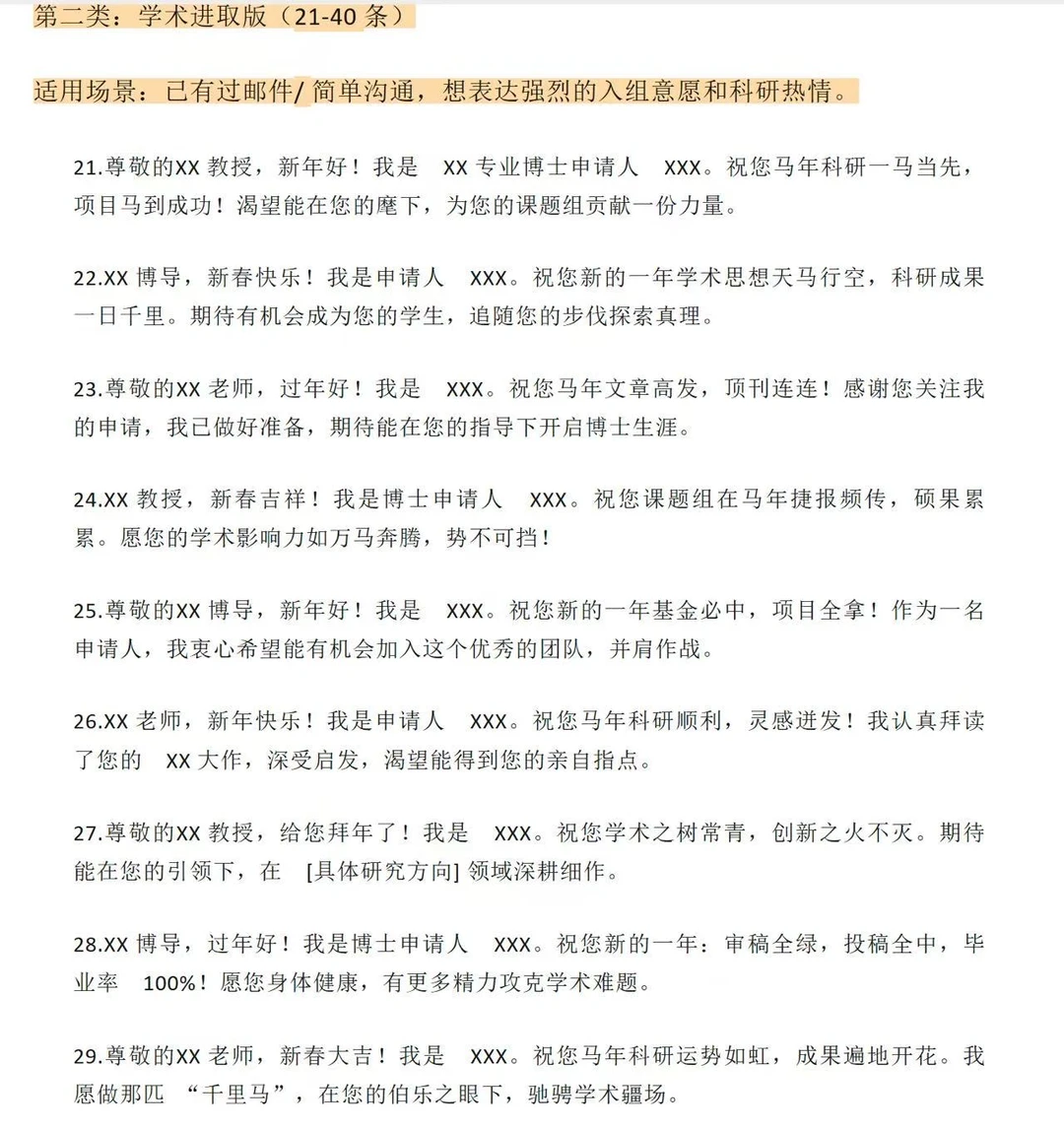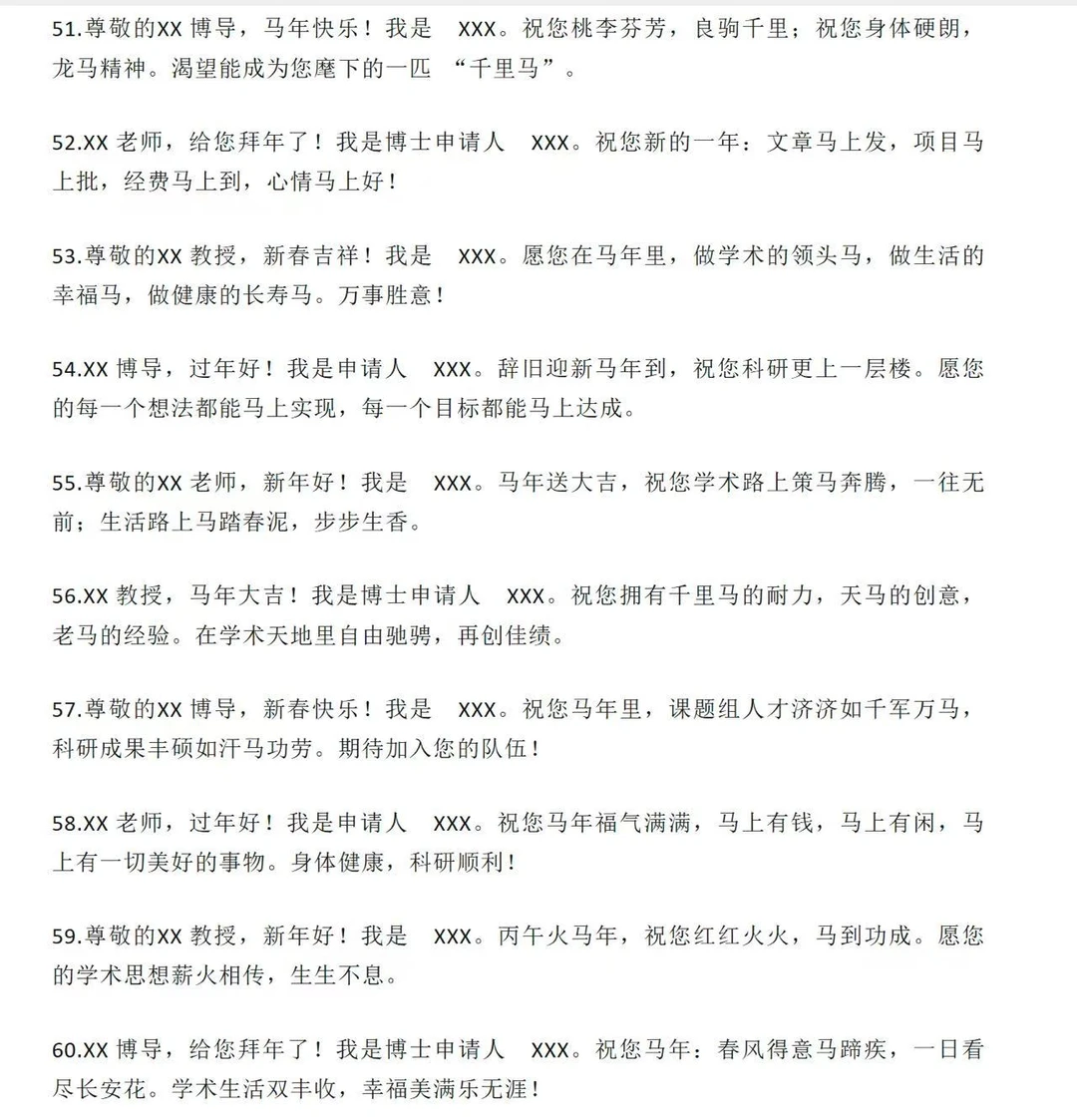 第一类:极致稳妥版(1-20 条)适用场景:首次联系、老师风格严肃、不确定老师喜好时的“安全牌”。1.尊敬的XX 教授,新年好!我是 XX 专业的博士申请人 XXX。值此丙午马年新春佳节,给您和家人拜年了!祝您新春快乐,身体健康,阖家幸福,万事顺遂!2.尊敬的XX 博导,过年好!我是申请人 XXX。感谢您在百忙之中阅读过我的申请材料。新春之际,祝您福暖四季,风禾尽起,科研之路长青,桃李满天下!3.XX 教授,新年快乐!我是博士申请人 XXX。辞旧迎新之际,祝您和家人龙马精神,岁岁平安。愿您在新的一年里工作顺利,生活美满,诸事皆宜。4.尊敬的XX 老师,给您拜年了!我是 XXX,一名渴望加入您课题组的博士申请人。祝您马年大吉,身体康健,家庭和美,在学术领域继续引领风骚。5.XX 教授,新春吉祥!我是申请人 XXX。感谢您为学术界做出的贡献,也感谢您给后辈学子的指引。祝您新的一年如意吉祥,科研硕果累累,生活喜乐安宁。6.尊敬的XX 博导,新年好!我是 XXX。值此佳节,祝您事业如日中天,成果层出不穷;祝您家人安康,福泽绵长。期待有机会得到您的指点。7.XX 老师,过年好!我是博士申请人 XXX。祝您在丙午马年:身体倍儿棒,心情倍儿好,科研顺风顺水,家庭幸福美满!
