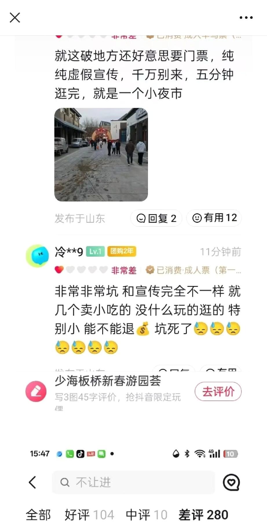 近日,青岛胶州市有市民反映说,胶州少海板桥新春游园的服务和宣传不符,根本不值那个票价,而且在看灯展时,景区突然停电,场面一度很混乱,很多游客纷纷要求退票,斥资400万元打造的景区就以这样的服务糊弄游客?该景区官方直播号共有评价约400条,其中差评就达280多条,说明这个景区真的是有问题!