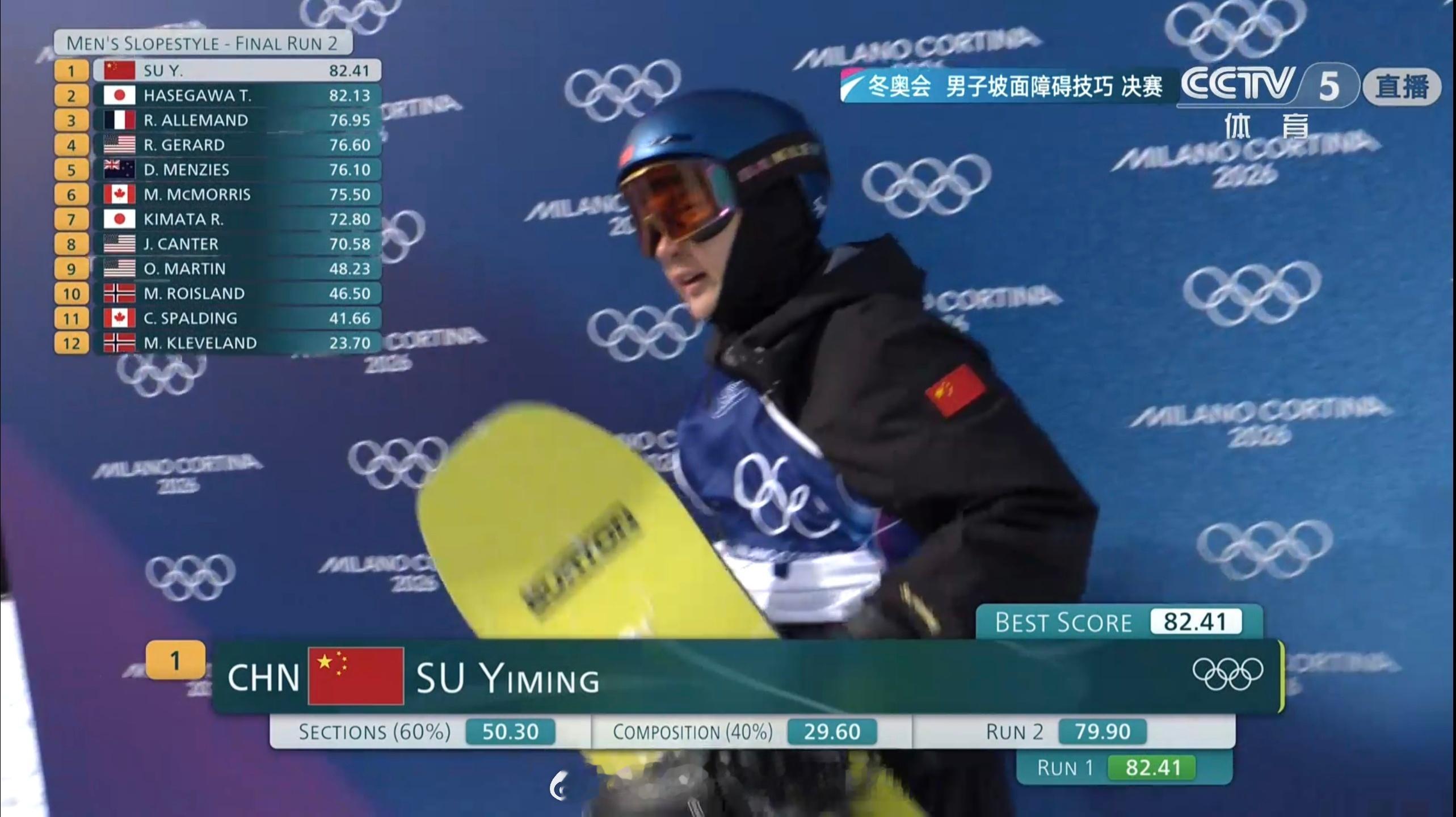 苏翊鸣完成22岁第一滑苏翊鸣首轮排第一苏翊鸣第一滑82.41