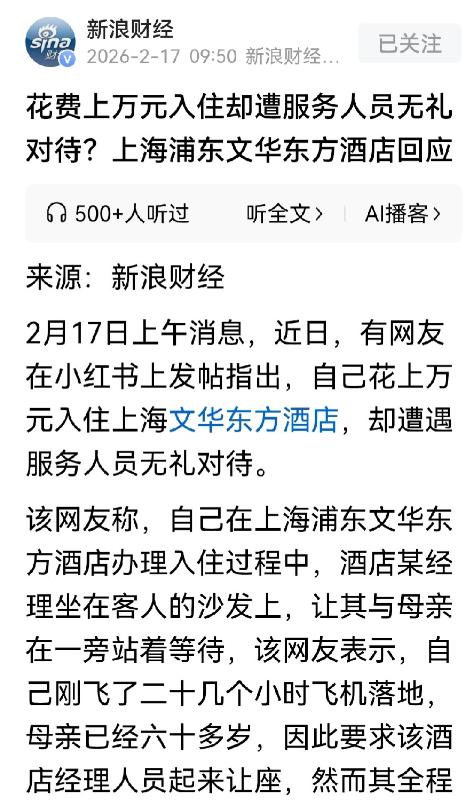 太离谱了!上海,大年初一,女子为了孝敬母亲,带老人入住上万元的上海顶奢酒店。 大年初一本来开开心心过年,这件事真的太让人生气。 女子带着 60 多岁的母亲,坐了 20 多个小时飞机到上海。 她花上万元住顶奢酒店,就是想让老人好好休息,过个舒心年。 办理入住时,母女俩累得不行。 想坐客人专属的沙发歇一歇。 结果酒店经理占着沙发,不肯让座。 经理说自己在培训扮演客人,不能中断。 女子当场发火,直接向酒店投诉。 酒店后来给她升级了套房。 本以为事情到此为止。 晚上吃饭时,那个经理还过来理论,全程不道歉。 第二天,另一位经理出面道歉,说补偿一顿午餐。 等去用餐才知道,每人只免单 500 元。 这家酒店单人午餐就要 880 元,补偿就是在糊弄人。 女子给酒店总部发邮件反映情况。 总部只回了一堆套话,没有任何实际解决方案。 找旅行社帮忙沟通,酒店一直躲着不回应。 花高价住酒店,本该享受对应的服务。 结果一路受气,连基本的尊重都没有。 经理培训是为了服务客人,却无视眼前的真实客人。 这样的做事态度,实在让人寒心。 消费者花钱消费,就该被认真对待,不该被这样敷衍。 对此,你怎么看?