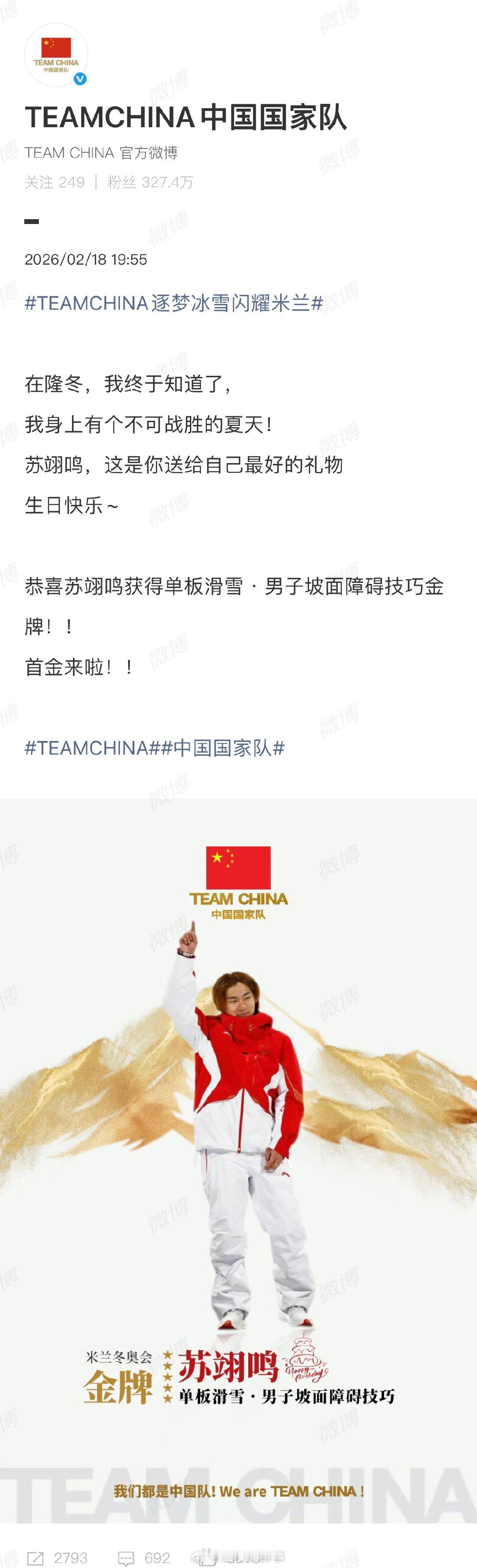 国家队祝贺苏翊鸣夺得首金国家队祝贺苏翊鸣夺冠 在2026年米兰冬奥会上,中国队的首枚金牌由苏翊鸣于2月18日生日当天斩获,他在单板滑雪男子坡面障碍技巧决赛中以第一跳82.41分的出色表现夺冠。中国队米兰冬奥首金