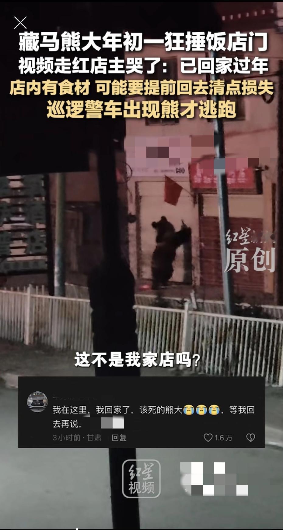 万万没想到!西藏一男子自己开的饭馆大年三十晚上被“黑熊客人”砸门闯入,而身为老板,竟然是在几千公里外的老家刷短视频,刷到自己店成了“网红”才知道此事。 2月17号,一段视频在网上传开了。地点是在西藏那曲羊秀乡的街头,大年三十晚上,临街一家饭店门口突然来了个“不速之客”。 虽说店铺关了门,门口还特意拉了一道铁丝网,可这根本拦不住一头快有成年人高的大黑熊。这家伙站起来对着卷帘门就是一通狂拍,没几下就把铁丝网给扯了个口子,连卷帘门也给往上扒拉开,大摇大摆钻了进去。 更逗的是,后面还跟着一头稍微小点的熊,一看就是“搭伴儿”进去找食吃 。 视频一发出来,评论区直接炸了锅。 有人开玩笑说:“这是过年了,熊也来给老板拜个晚年?” 还有吃货网友脑补:“这家菜肯定做得特别香,不然能把熊招来?” 。 不过也有不少人心提到了嗓子眼,这万一店里要是有人,碰上这两头大家伙,后果真不敢想。 就在大伙都替老板捏把汗的时候,老板李先生(化姓)人居然还在甘肃,正过着自己的年呢。 他也是无意中手指一划,刷到了这条热闹视频。定睛一看,他懵了,这不是自己在西藏那曲开的饭馆吗? 老板说自己都回老家一个月了,店里确实没人。虽然装了监控,可那两天也不知道咋回事就是连不上,“我也是看短视频才知道家里进熊了” 。 后来老板一打听,这两头熊大概是闻着店里过年存货的味来的,里面有肉、有油、还有鸡蛋。 好在除夕夜乡里有巡逻车路过,警车声音一响,这俩“偷吃贼”也就溜之大吉了 。李先生估摸着,这一趟损失恐怕几千块钱是跑不掉了,他正想着要不要提前结束假期,赶紧回去看看店里被祸害成啥样了 。 对于此事,你们怎么看?