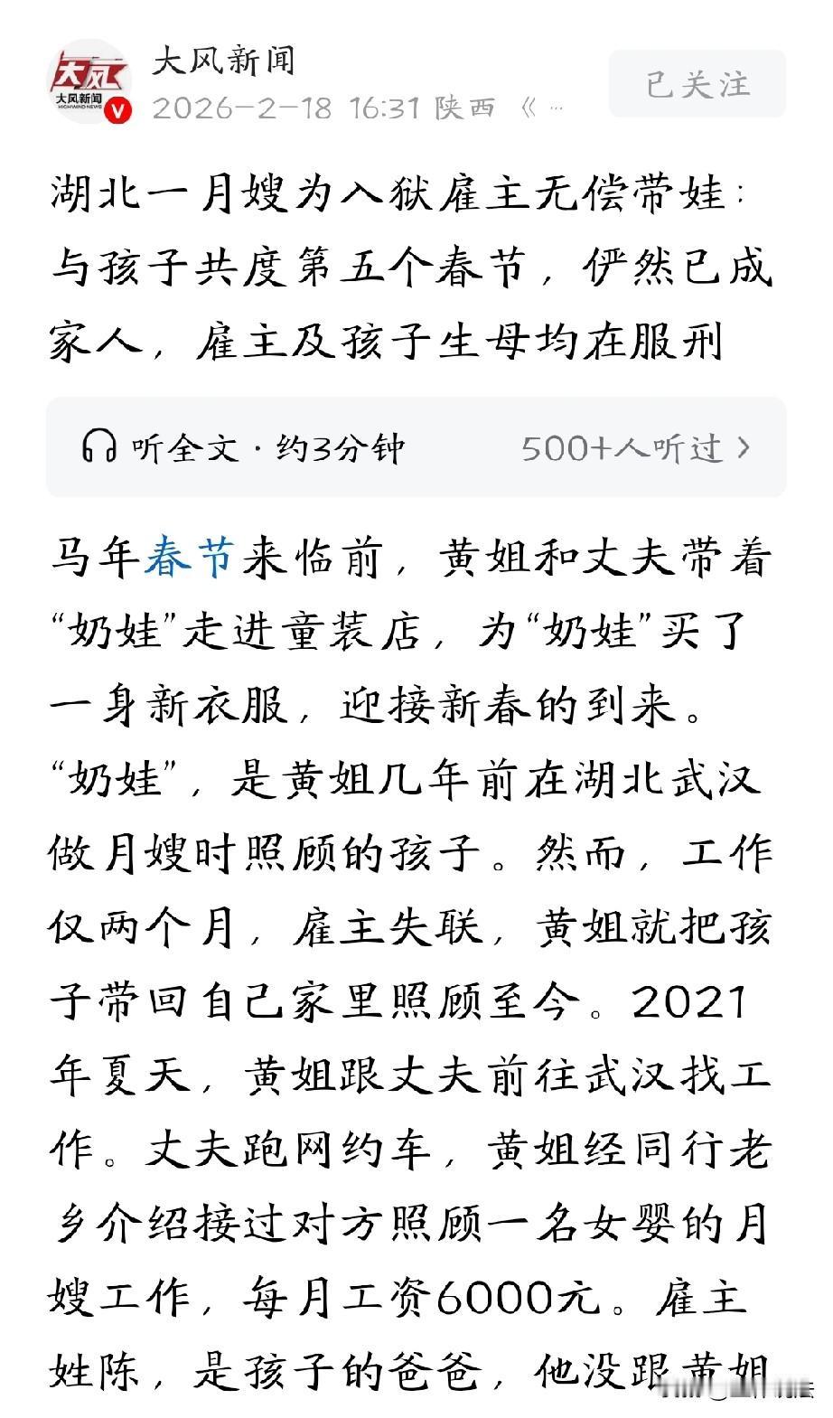 湖北十堰,女子当月嫂两个月,雇主突然消失,留下一岁多的孩子让她帮忙照顾,房东也不停的催租。女子只能把孩子带回老家照顾,这一照顾就是五年多。原来,孩子的父亲和生母都入狱服刑,刑期还不短,这期间不少人劝她把孩子送到儿童福利院,但女子不愿意,她表示:多年的照顾让她和孩子已经产生浓厚的感情,俨然成为了一家人。 2021年夏天,湖北十堰的黄姐和丈夫一起去武汉找工作,丈夫靠着跑网约车谋生,黄姐则经老乡介绍,接了一份月嫂的工作,负责照顾一名一岁多的女婴,每月工资6000块。 雇孩子的是孩子的爸爸陈某,两人从头到尾没见过面,只通过电话沟通。 陈某在电话里反复叮嘱黄姐,一定要好好照顾女儿,还提前预支了两个月的工资。 黄姐照顾孩子的房子是陈某租的,刚接手时,陈某把奶粉、尿不湿、衣服等用品都备得很齐全,平时也会偶尔打电话问问孩子的情况,这让黄姐心里挺踏实,觉得雇主还算靠谱,只想安安稳稳把孩子带好。 可这份安稳只持续了两个月,陈某突然彻底失联,电话打不通,人也找不到。 紧接着,房东找上门来,说房租到期了,催着黄姐交房租,黄姐一下子慌了神。 没过多久,一个自称是陈某朋友的人打来电话,说陈某出了事,让黄姐先帮忙继续照看孩子,工资之后一定会一分不少补上。 黄姐虽然心里没底,又着急又为难,但看着怀里还不懂事的女婴,实在狠不下心不管。她想着先暂时照顾几天,等雇主那边有消息了,就能把孩子送回去。 可眼看着第一个春节都到了,陈某还是杳无音信,也没人来接孩子,房东又不停催租,黄姐没办法,只能咬咬牙,把孩子带回了十堰老家。 回到老家后,黄姐依旧抱着一丝希望,总觉得雇主说不定哪天就会出现,把孩子接走。 在她心里,只要孩子没被接走,自己作为月嫂就有责任把孩子照顾好。 日子一天天过去,雇主始终没有露面,黄姐也慢慢把孩子当成了家里的一份子,吃喝拉撒、生病照顾,全都亲力亲为,丈夫也一起帮忙照料,两人把所有的耐心和关爱都给了这个没有血缘关系的孩子。 2023年,孩子到了该上幼儿园的年纪,可孩子一直没有户口,根本没法入学。 这时黄姐和丈夫才意识到问题的严重性,两人赶紧报警,向相关部门求助,希望能找到孩子的亲生父母,解决户口问题。 调查结果让所有人都很意外:孩子的父亲陈某正在浙江监狱服刑,刑期还有十多年。 陈某在狱中给黄姐写了一封信,信里满是感激,说黄姐是心地善良的人,在无人过问的情况下对女儿不离不弃,就是孩子最亲的人。 万万没想到,事情并没有这么简单,经过DNA比对,黄姐发现陈某和孩子根本没有血缘关系,孩子没法跟着他落户。 警方又根据疫苗本上的信息,找到了孩子的生母,可让人没想到的是,孩子的生母也正在服刑。这下,孩子成了无人照料的状态,身边只有照顾了她好几年的黄姐一家。 这五年里,身边不少人都劝黄姐,把孩子送到儿童福利院,既能减轻家里的负担,也不用一直操心。 可黄姐每次都拒绝了,在她看来,把养了这么久的孩子送走,实在太残忍了。 五年的朝夕相处,孩子早就喊她妈妈,喊丈夫爸爸,和家里人亲密无间,即便没有血缘关系,情感上早已是真正的一家人。 今年,是孩子跟着黄姐一家过的第五个春节。春节前,黄姐和丈夫特意带着孩子去童装店,挑了一身新衣服,就像对待亲生孩子一样。 当地街道办也得知了她们的情况,上门慰问,还给孩子送来了红包。 过年期间,夫妻俩还会像往年一样给孩子发压岁钱,带着孩子回乡下走亲戚,一家人热热闹闹,格外温馨。 黄姐表示,不管以后怎么样,她都会一直把孩子带在身边,好好把她养大,这份没有血缘的亲情,早就成了她放不下的责任和牵挂。 《民法典》第九百七十九条规定:管理人没有法定的或者约定的义务,为避免他人利益受损失而管理他人事务的,可以请求受益人偿还因管理事务而支出的必要费用;管理人因管理事务受到损失的,可以请求受益人给予适当补偿。 黄姐对孩子无法定抚养义务,原月嫂雇佣关系因雇主失联、房租到期已终止,后续照顾无合同约定。 其次,她带孩子回老家、承担衣食住行与教育,是为避免孩子无人照料、利益受损。 最后,管理行为符合公序良俗,即便雇主未明示,也不影响无因管理成立。 因此,黄姐有权向孩子生父、生母主张五年间的奶粉、医疗、教育、生活等必要费用偿还,若因带娃减少收入、产生额外支出,还可主张适当补偿。