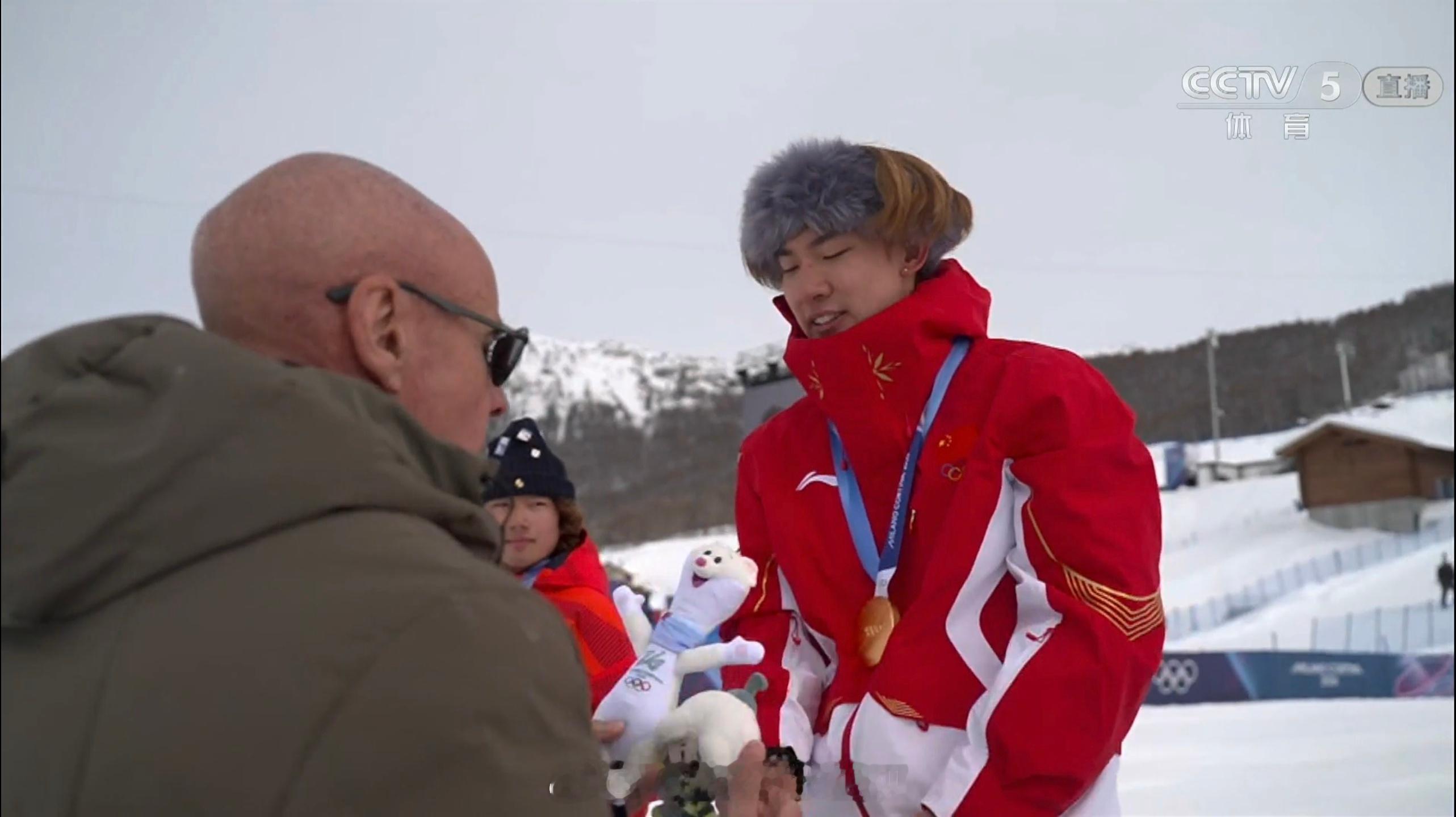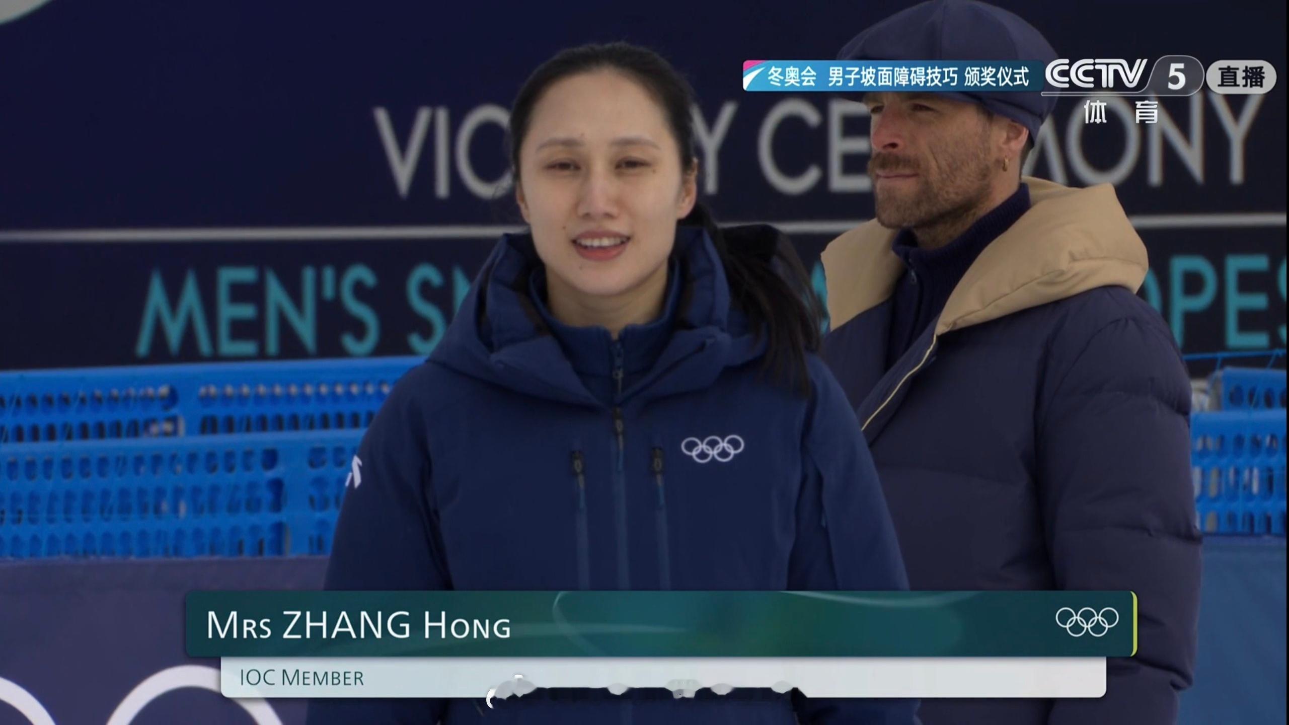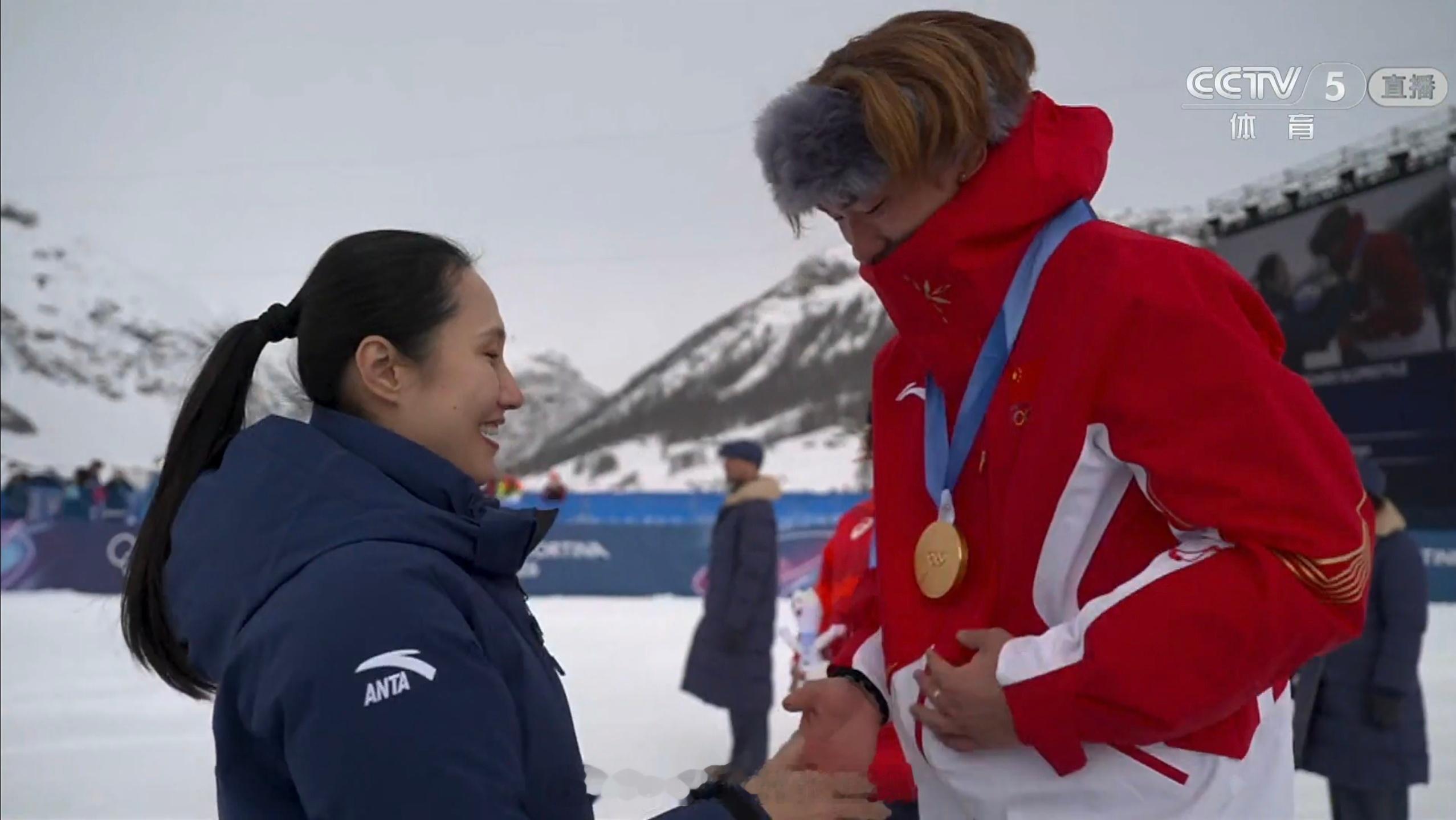 拿下中国速度滑冰冬奥历史首金的国际奥委会委员张虹为苏翊鸣颁奖!!!