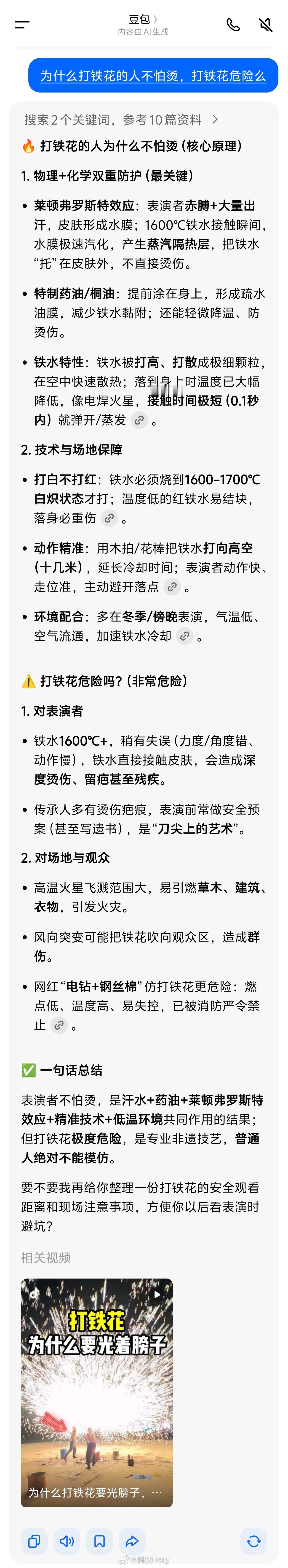 当然除了春晚揭秘之外,咱们大过年的,看节目遇到好奇的也能直接问豆包,就比如说我昨天就围观的打铁花,为啥打铁花的人不怕烫呢?最终豆包给了我答案。