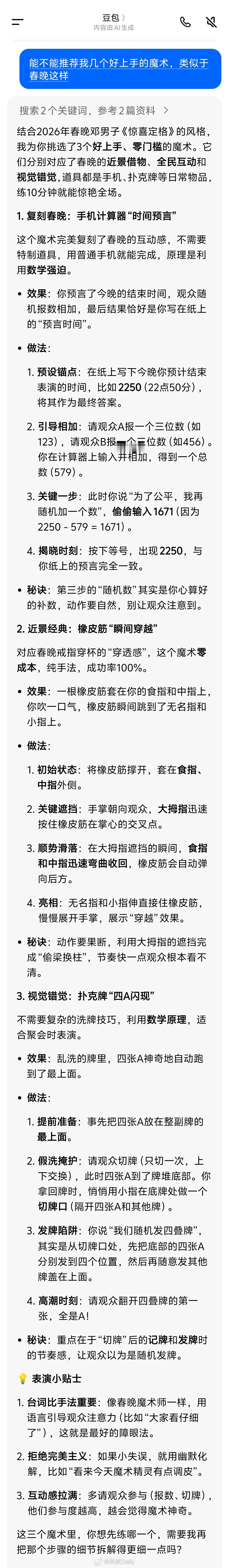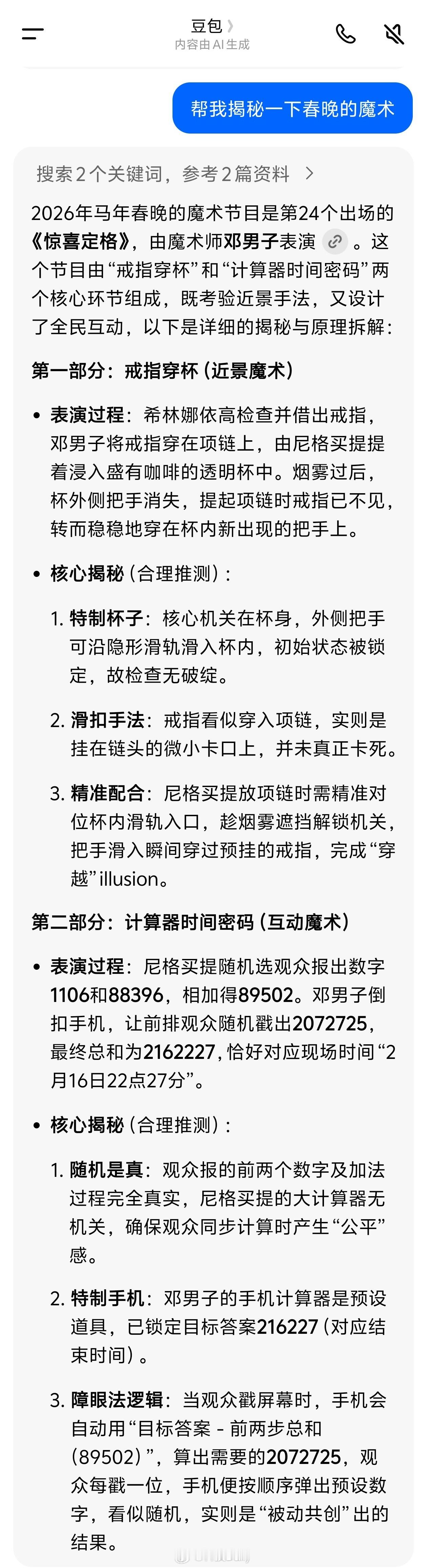 豆包解密春晚魔术 以前春晚魔术怎么实现的让人摸不着头脑,现在看见魔术好奇原理和实现方式,直接问AI,豆包直接出答案,这物理外挂确实好使。