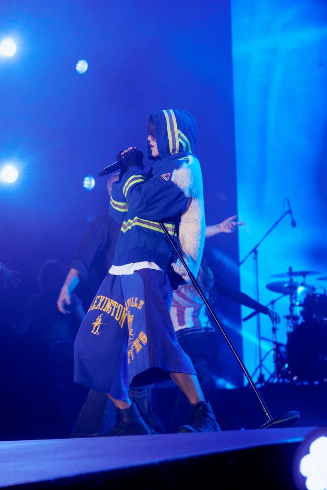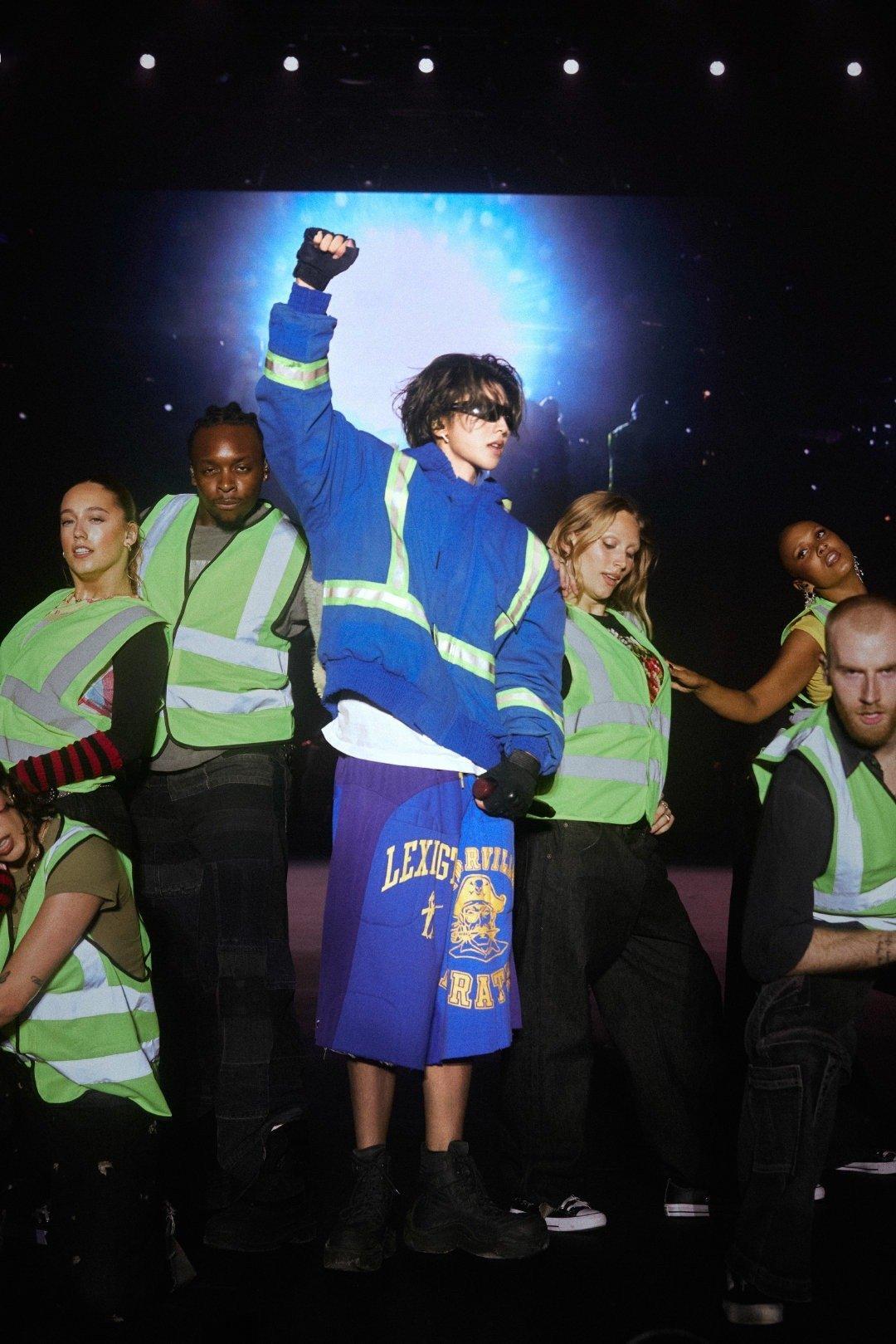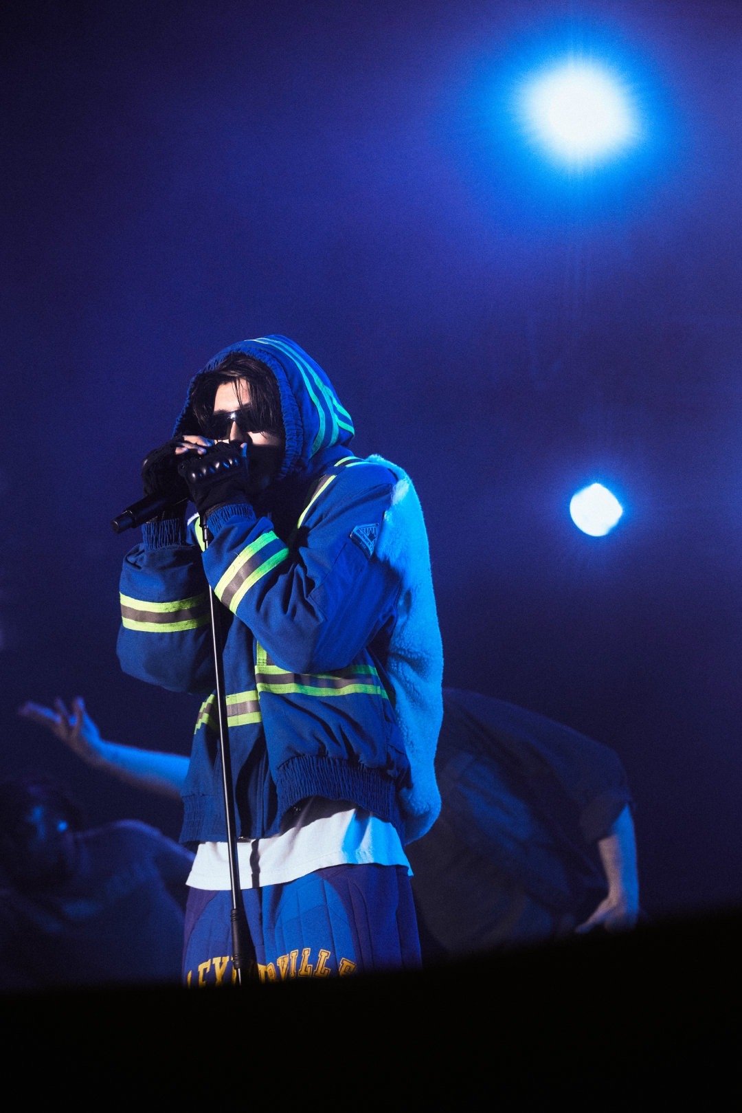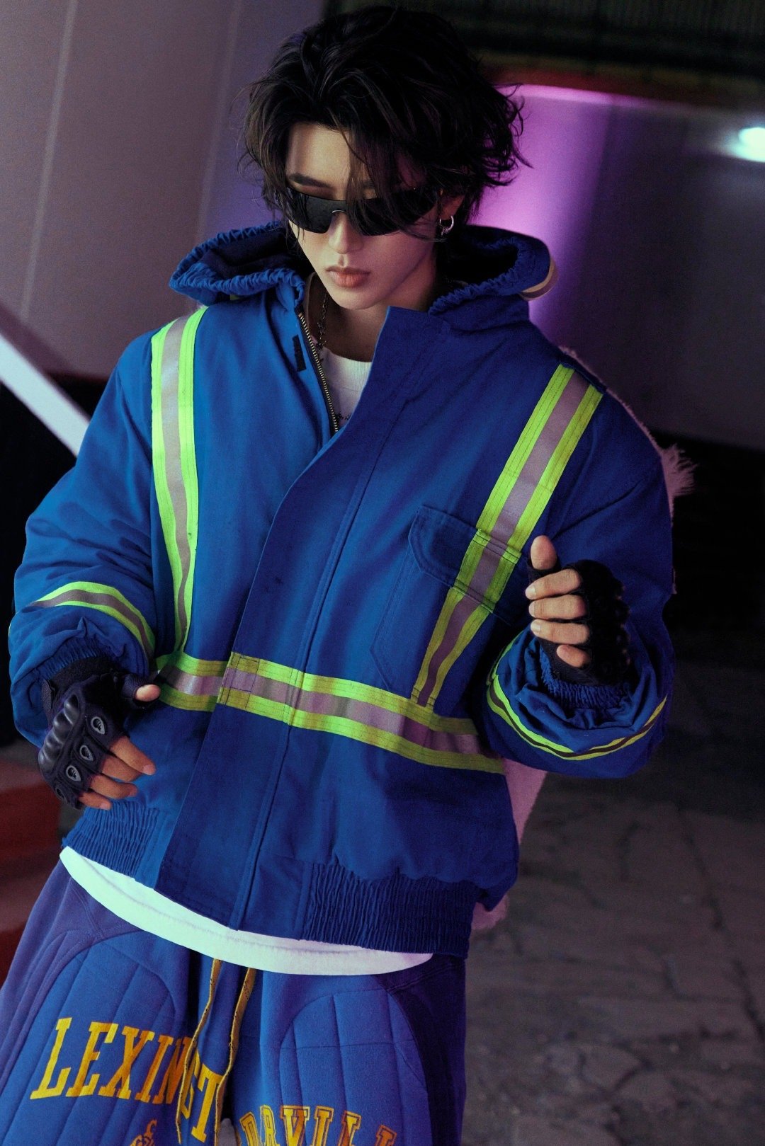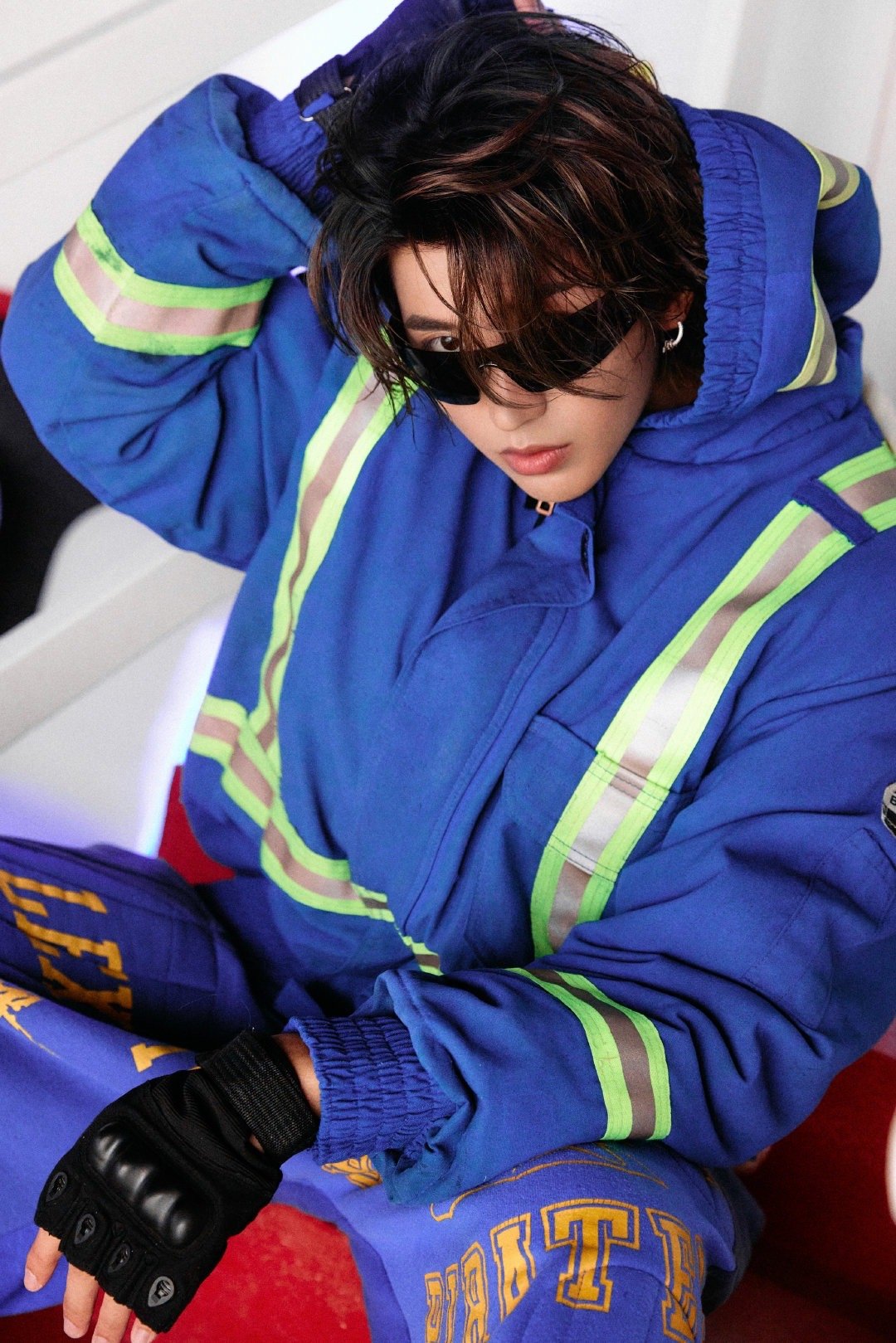 蔡徐坤|迪拜音乐节造型出图,上身Joshua Jamal 蓝色连帽夹克套装,佩戴Gucci 墨镜,脚踩Bottega Veneta 鞋履,气场全开,一场视觉盛宴