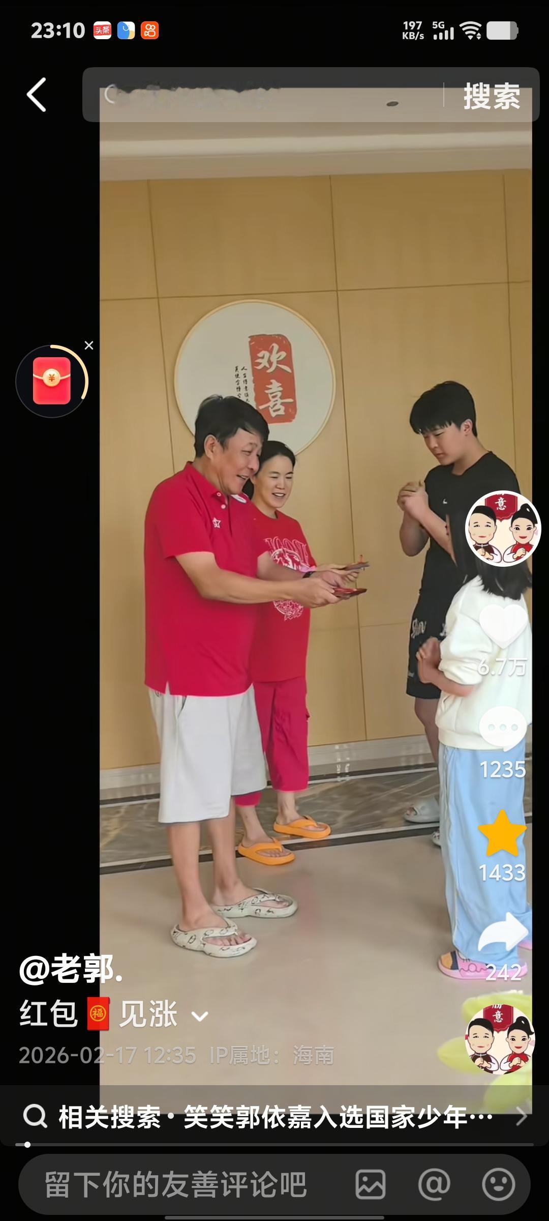 大年初二王楠和老郭收到女儿笑笑送的礼物,乐得合不拢嘴。王楠想打开老郭的,结果老郭马上把盒子藏起来,说这是给我的。 这两口子也太搞笑了。好长时间没看到笑笑的身影,感觉这孩子又长高了不少 三十下晚的时候,王楠和老郭都穿的红衣服,喜气洋洋。给儿子和女儿送上厚厚的大红包。 展开女儿的红包。红票票太多了,噼里啪啦掉了一地。哥哥看到了马上提要帮妹妹保管。 笑笑手急眼快。和妈妈趴在地上把钱收在一起。又顺手抢过哥哥的红包,说我替你保管。 看着小哥俩欢欢喜喜过新年,王楠两口子乐的前仰后合。 唯一的遗憾就是笑笑还没有入选国少队。其实这孩子乒乓球打的真不错,每次都能获得选拔资格。 离成功也只差一点点。但王楠坚决的表示不走后门。两口子要让女儿凭自己的实力来打。 同时也要兼顾学业。只要孩子健健康康,幸福就好。这一家人。日子过得红红火火。 小孩子也教育的如此优秀,真是让人羡慕。