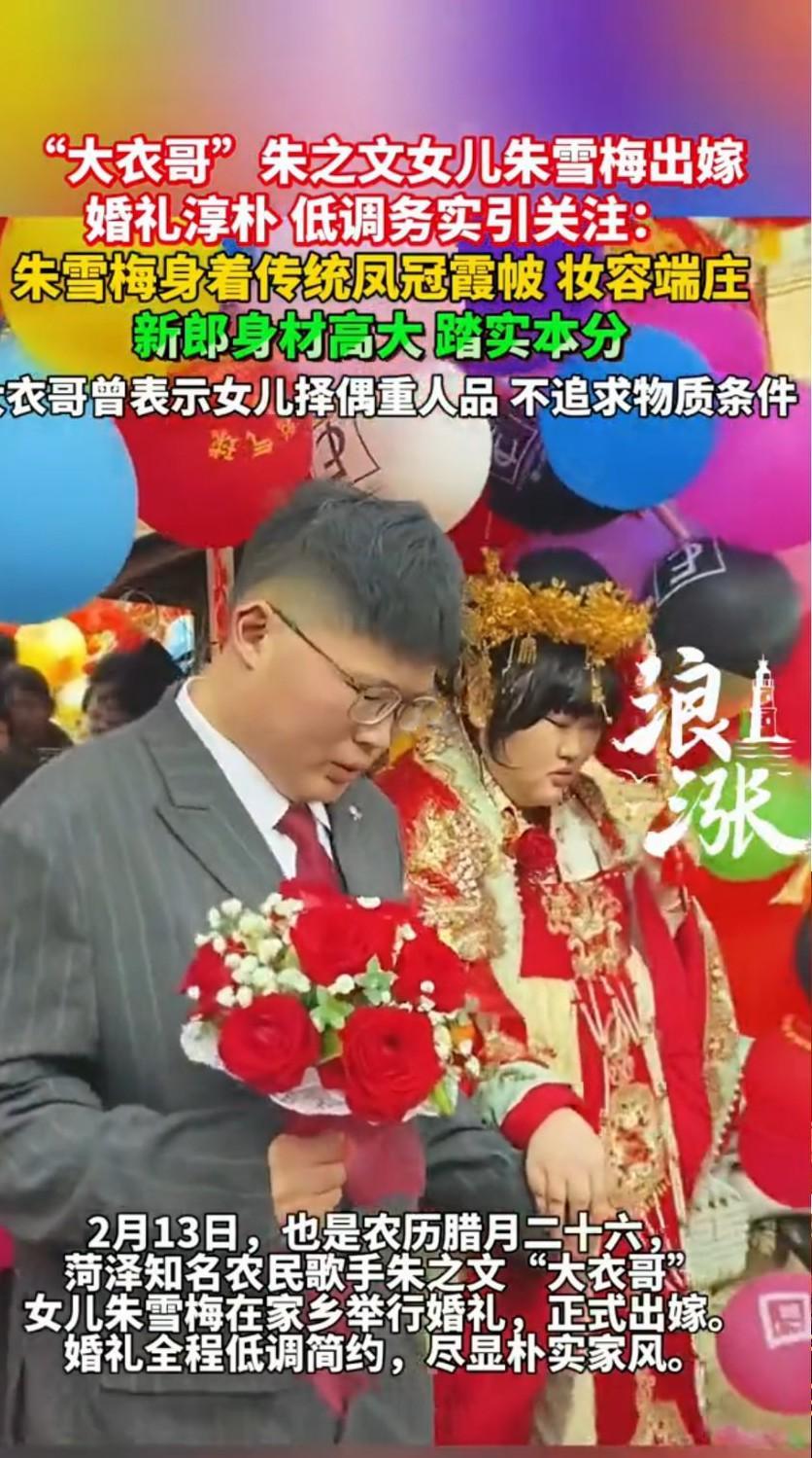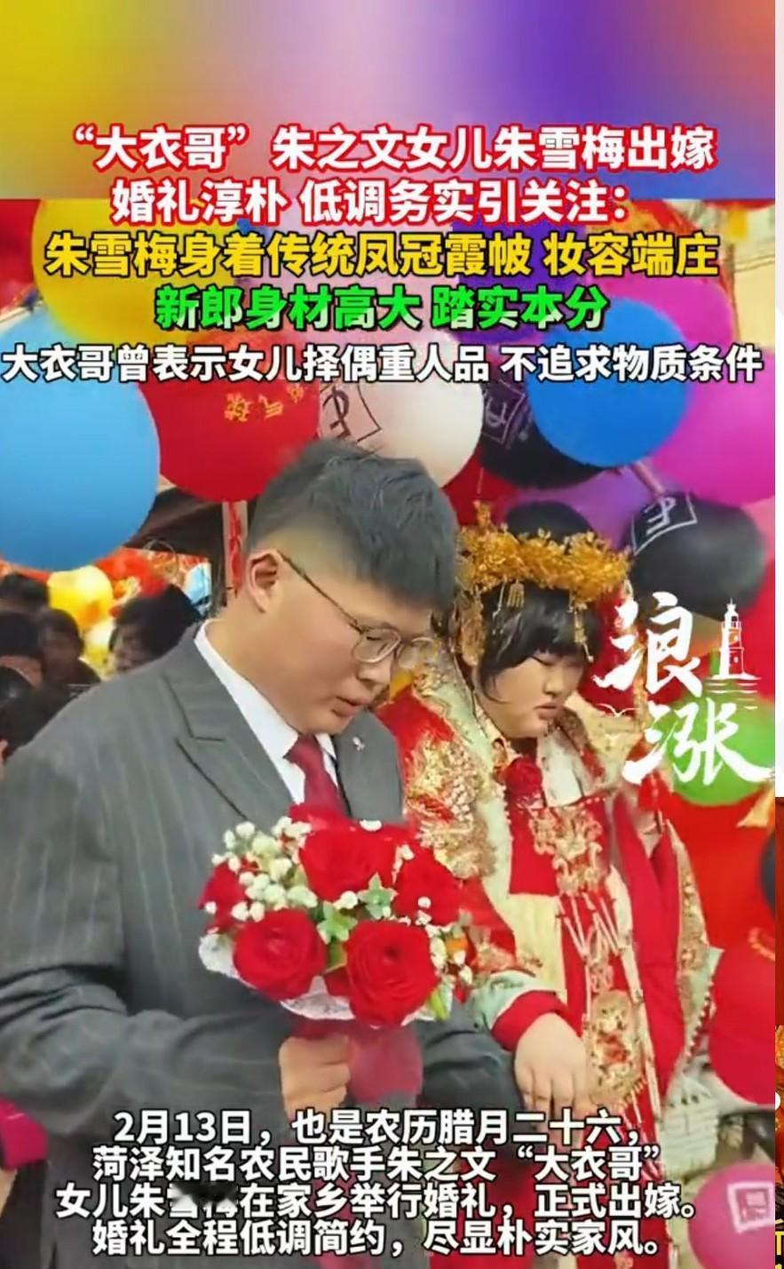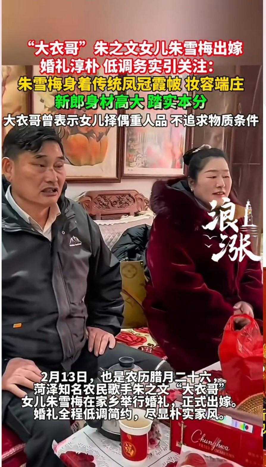 大衣哥女儿嫁了,新女婿不是富二代,不是高管,就是个收废品的小伙。 这事儿听着就有点意思。 别以为大衣哥家财万贯,就得找个门当户对的豪门。 人家吸取了儿子婚姻的教训,这次是真想开了。 比起金钱地位,他们更看重人品。 新女婿虽然普通,却有股农村人的纯朴和踏实劲儿。 5月10日,婚礼在老家低调办了。 大衣哥笑得合不拢嘴,现场简单但喜庆。 这哪是明星嫁女儿,分明是普通人家的喜事。 这告诉我们,找对象,兜里多少钱真不是最重要的。 人品过硬,比什么都强。