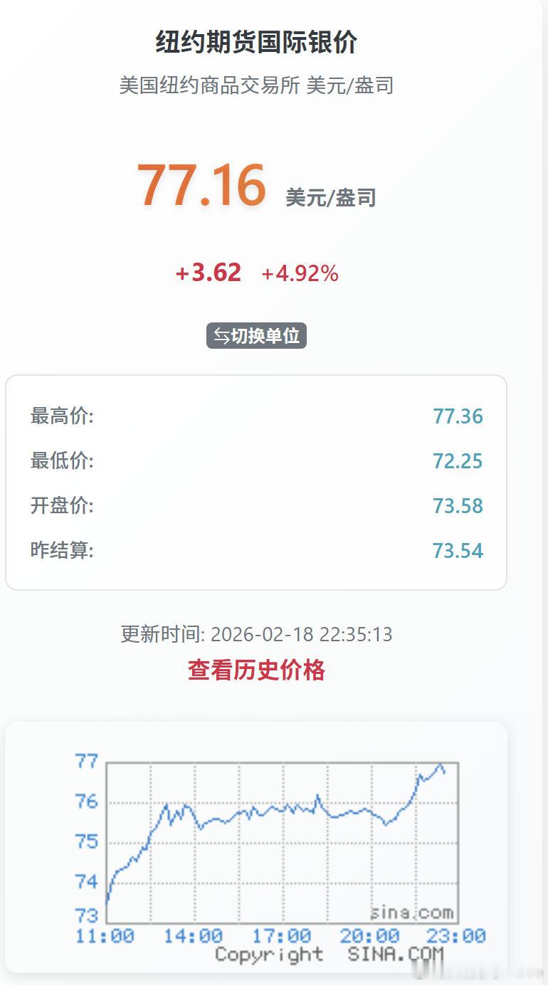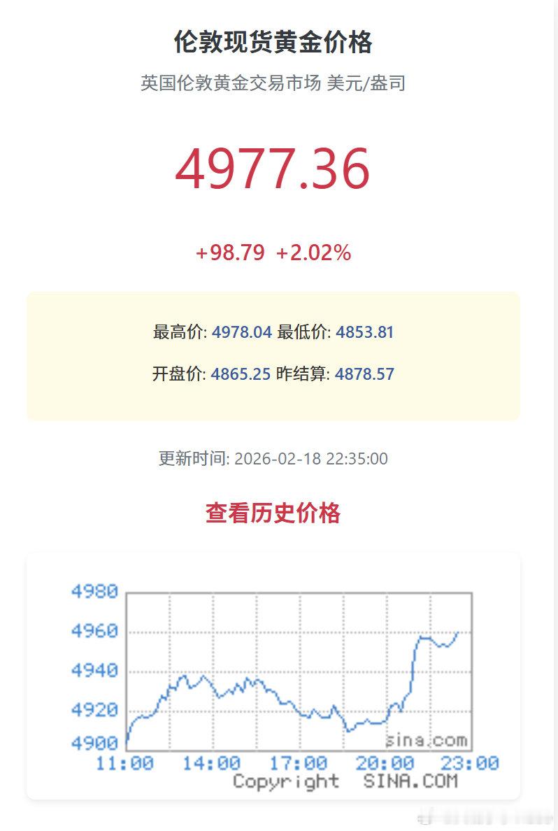 【白银涨5%国际金银又大涨】2月18日,现货白银日内大涨5.00%,现报77.23美元/盎司。现货黄金日内大涨2.00%,现报4974.99美元/盎司。(金十数据)