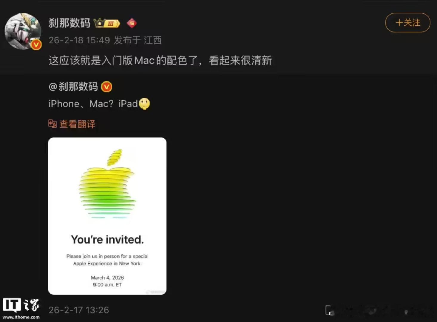 【曝苹果发布会邀请函平价版MacBook或3月4日发布】 2 月 18 日消息,博主刹那数码 援引苹果 3 月 4 日发布会邀请函,透露苹果届时将推出传闻已久的平价版 MacBook,邀请函中苹果 Logo 正是“入门版 Mac 的配色”。