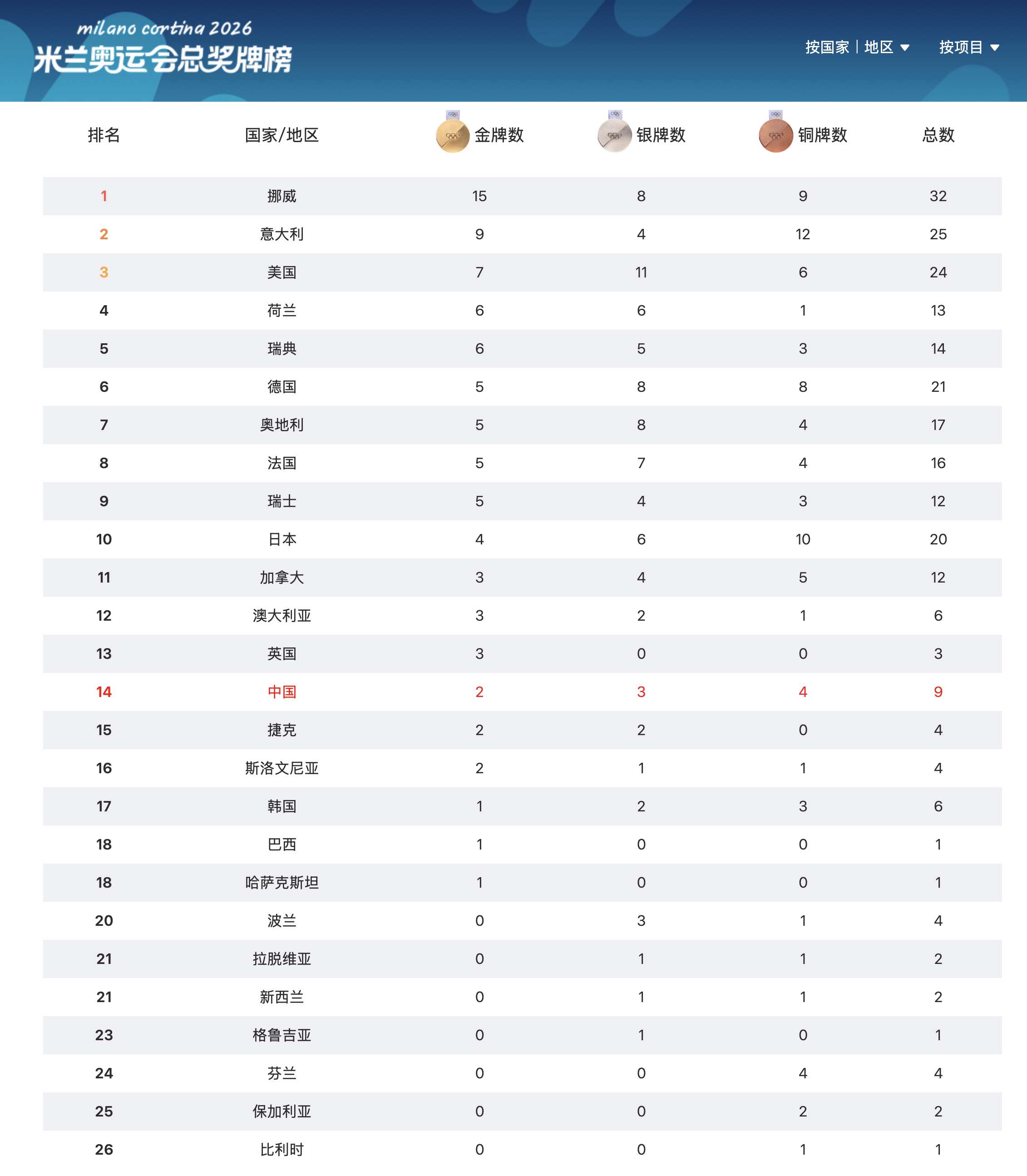 中国队连夺两金,目前2金3银4铜奖牌榜升至第14位! 中国奖牌榜反超韩国徐梦桃金牌苏翊鸣金牌