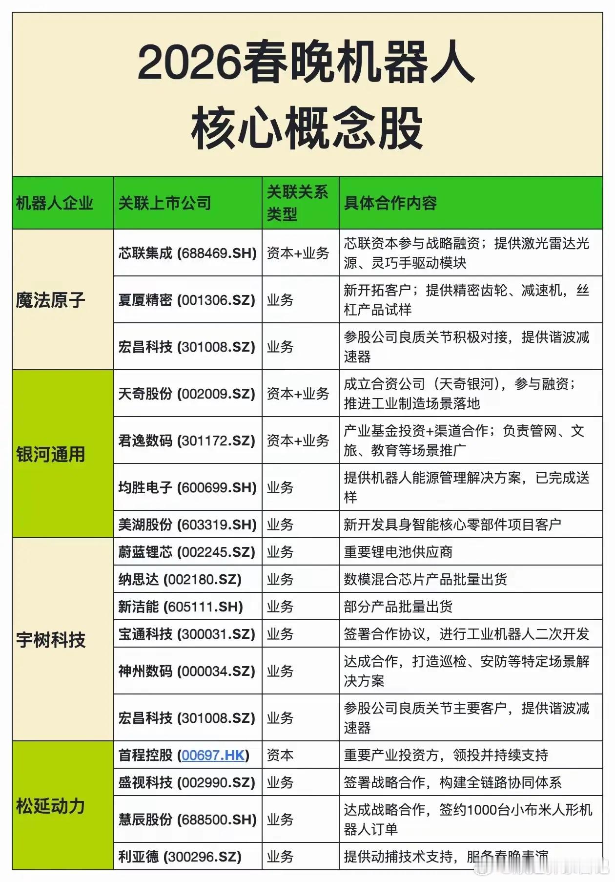 春晚机器人上热搜,机器人概念全景梳理:1.宇树科技相关:①参股:金发科技、首开股份、卧龙电驱、吉华集团、景兴纸业、荣晟环保②合作商:长盛轴承,宏昌科技,盛通股份,新洁能,凌云光,德邦科技,凯旺科技。③供货:绿地谐波,中大力德,长盛轴承,鸣志电器,新洁能,卧龙电驱。2.松延动力:绿地谐波,奥普特,利亚德。3.魔法原子:芯联集成,夏厦精密,绿地谐波,宏昌科技,富乐德。4.银河通用:天奇股份,百达精工,鸣志电器,绿地谐波,君逸数码。