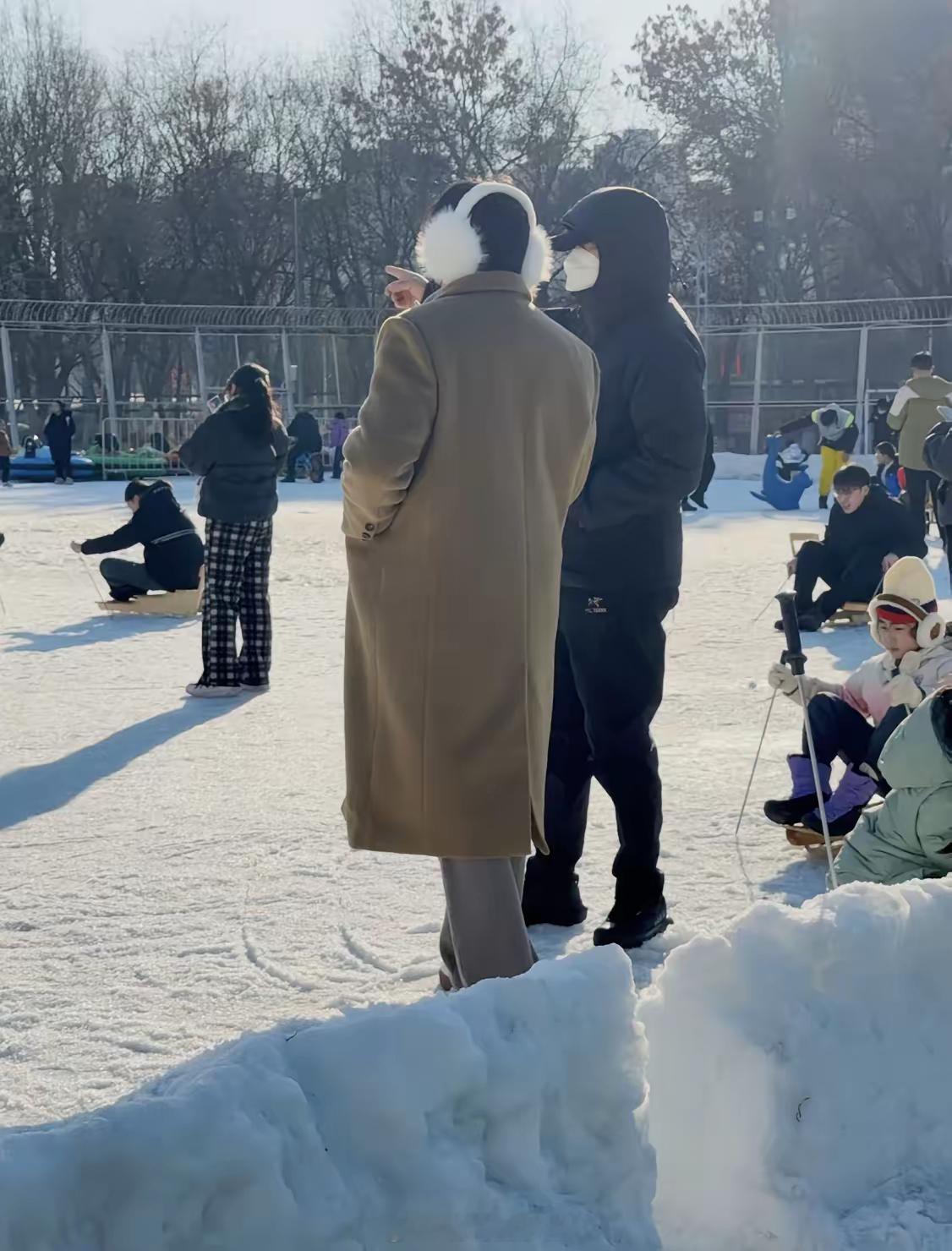 秦昊过年回老家沈阳,带孩子玩冰车。钢铁直男带着白色耳包很显眼。