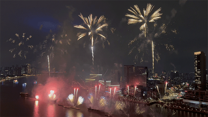 海门回望千峰涌,港口骏马万里腾老舍的句子印在烟花上大湾区的烟火广州、汕头美丽 广