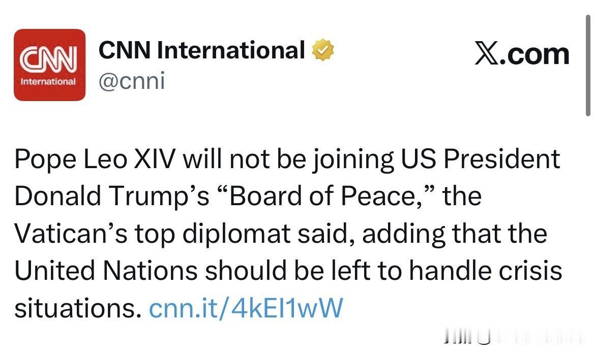 美国有线电视网报道:梵蒂冈高级外交官表示,教皇利奥十四世不会加入美国总统唐纳德·特朗普的“和平委员会”,并补充说,应该让联合国来处理危机局势。 背景资料:美国总统特朗普在达沃斯论坛宣布成立的“和平委员会”,真正参与者寥寥无几。联合国安理会成员国除美国外,无一加入这个委员会。