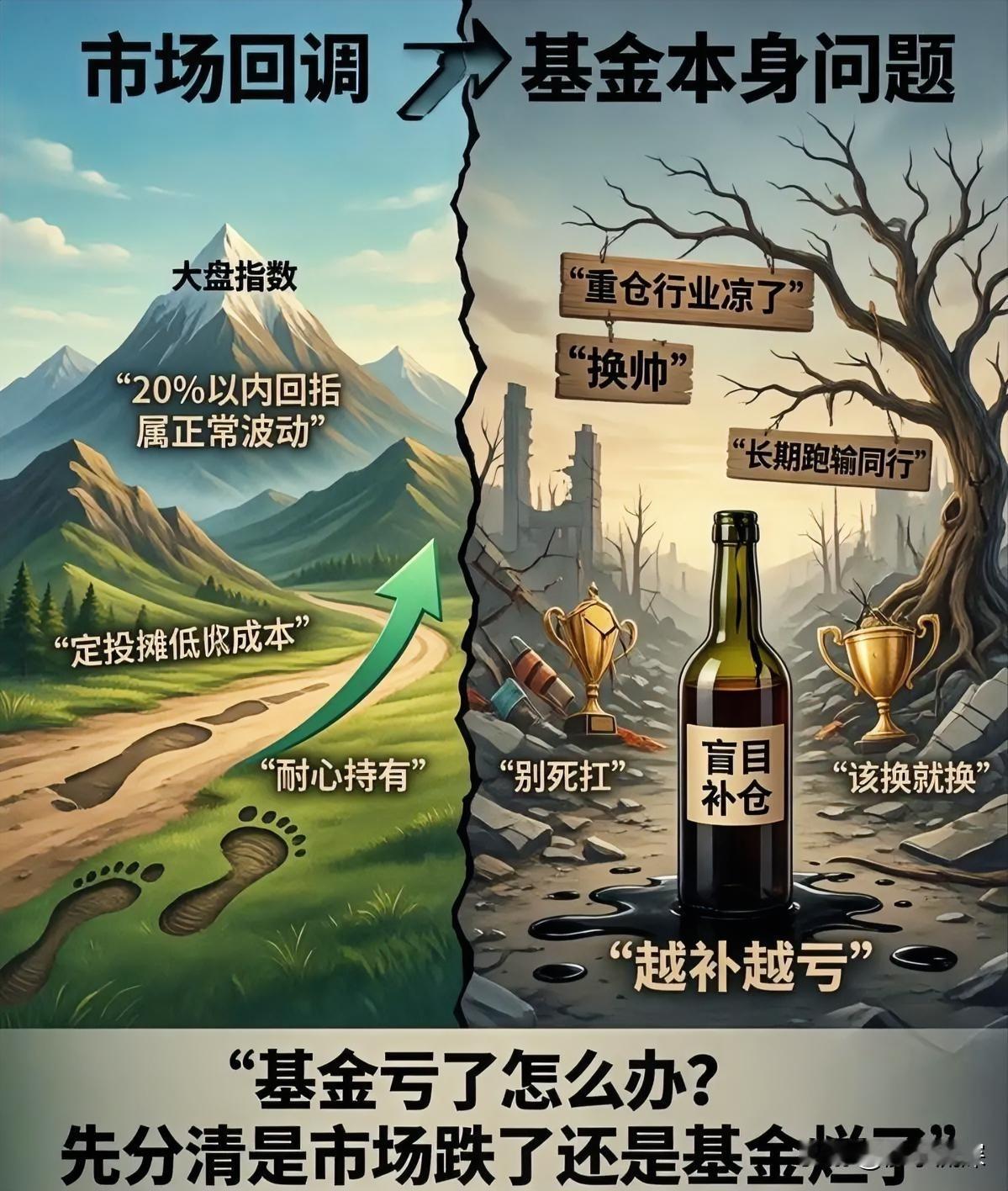 基金亏了怎么办,先分清是市场跌了还是基金本身烂了。如果是市场整体回调,20%以内的回撤算正常,拿住或者定投摊低成本都行。 但要是基金长期跑输同行、换了基金经理、重仓行业凉了,那别死扛,该换就换。 最怕的是盲目补仓,很多人一看亏了就想着加仓拉低成本,结果加到一只烂基里,越补越亏。补仓只适用于基本面没问题的基金,病树等不来春天。 亏钱不可怕,可怕的是不反思,也别急着骂娘,先看看是哪出了问题。