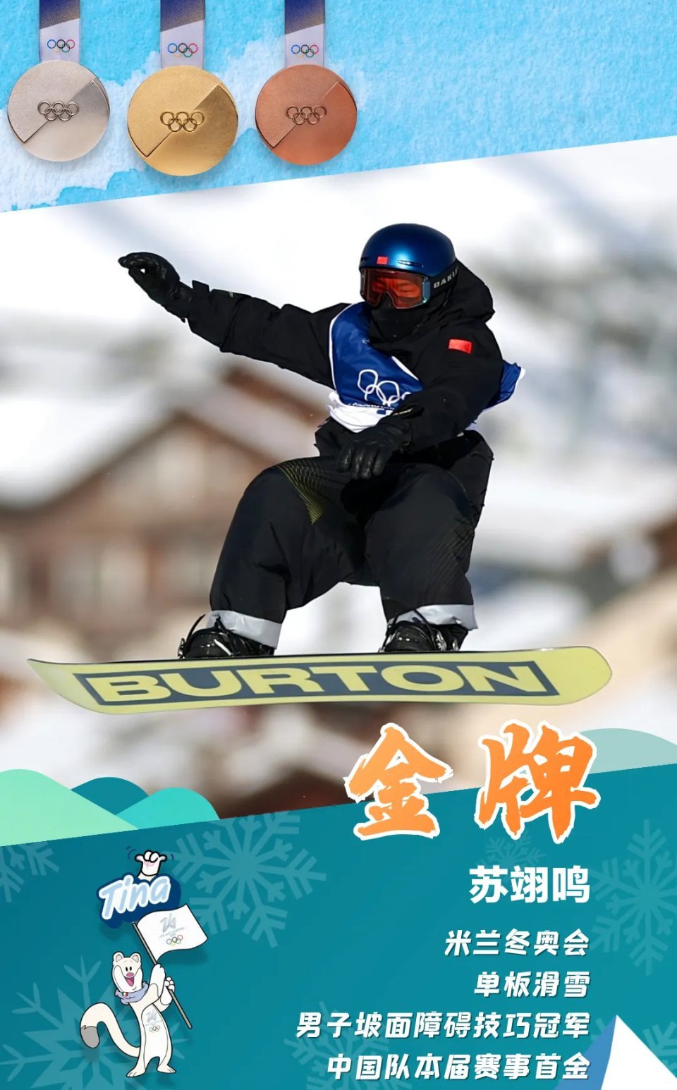 苏翊鸣金牌18日,在意大利利维尼奥举行的米兰冬奥会单板滑雪男子坡面障碍技巧决赛中,中国选手苏翊鸣以82.41分获得金牌。这是本届冬奥会中国队获得的首枚金牌,当天他两次落泪。