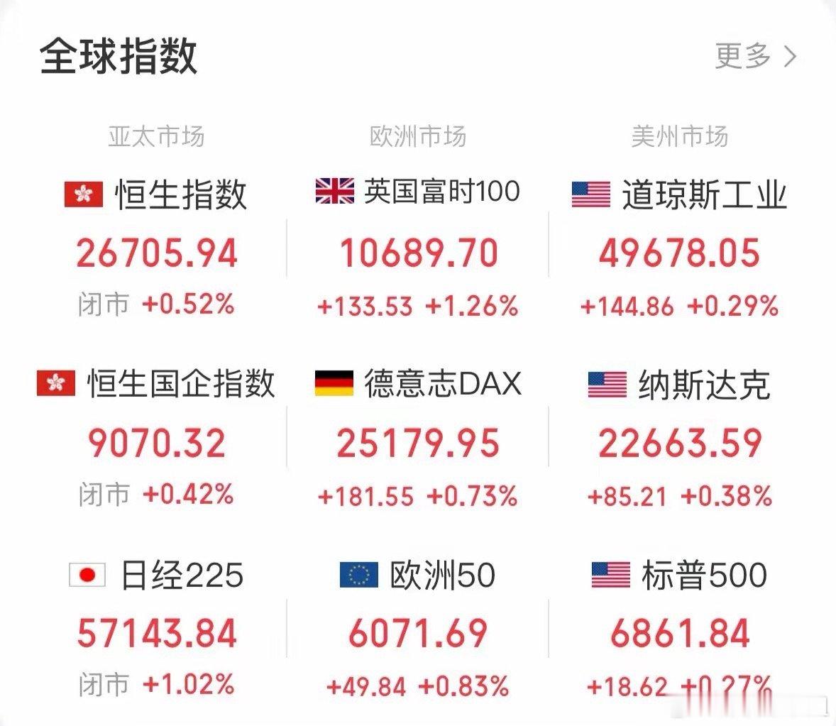 只要A股不开门,全球股市都在涨英国指数今晚创历史新高:大年初二,2月18日晚上,A股还在春节假期期间,全球股市都在上涨,其中英国、德国、欧洲股市都大涨,英国指数突破10000点创历史新高。看来A股不开门对全球股市都是利好,美股今晚也继续上涨,英伟达和科技股继续上涨。整体看,春节期间全球股市没有问题,都还在上涨趋势中,这也利好A股,节后马年股市开门红可期。