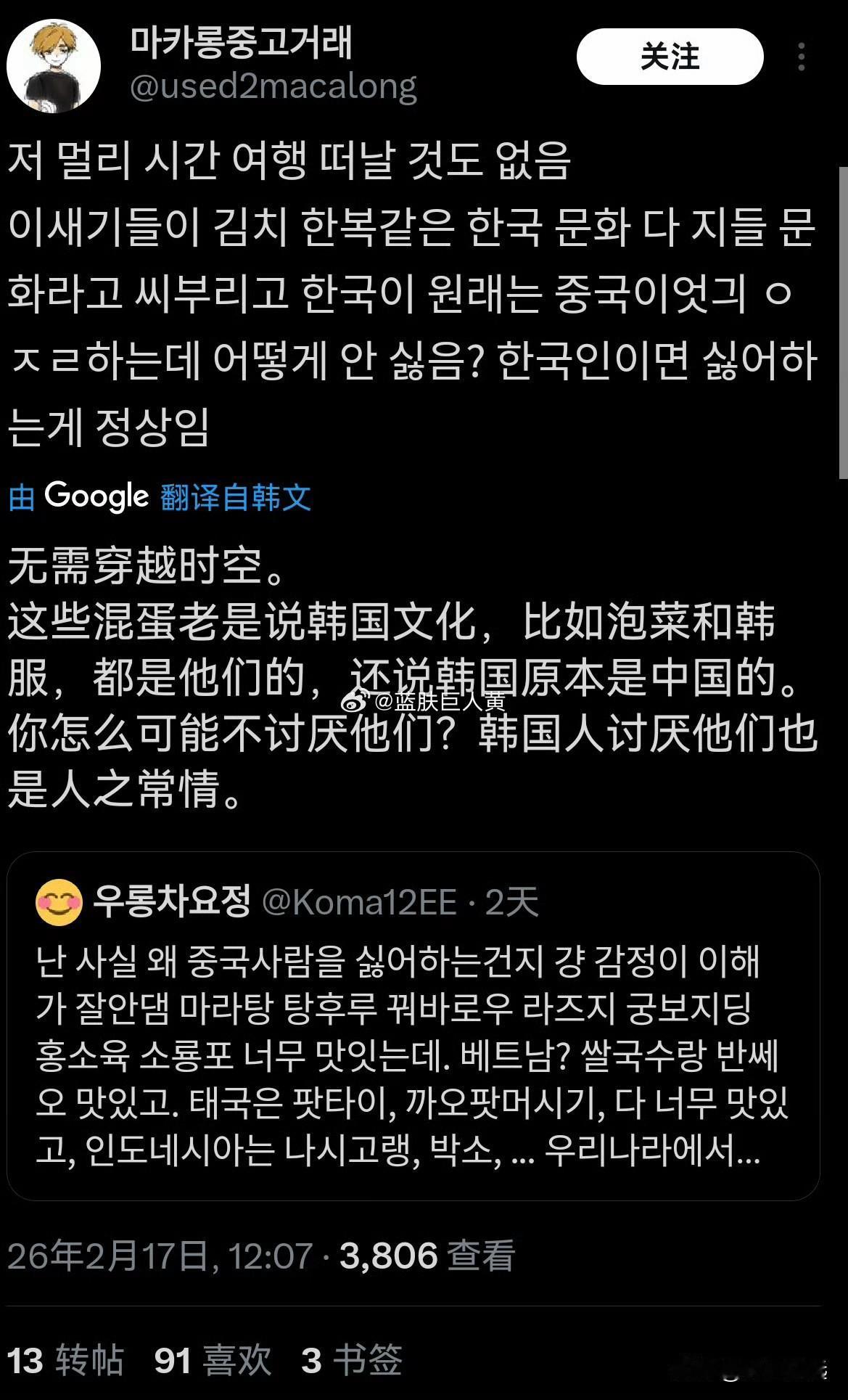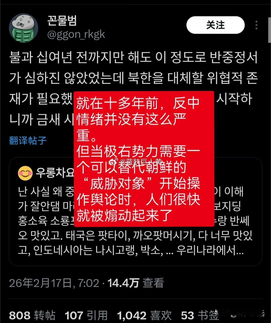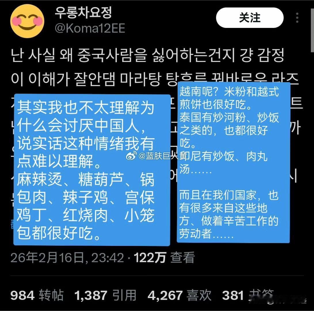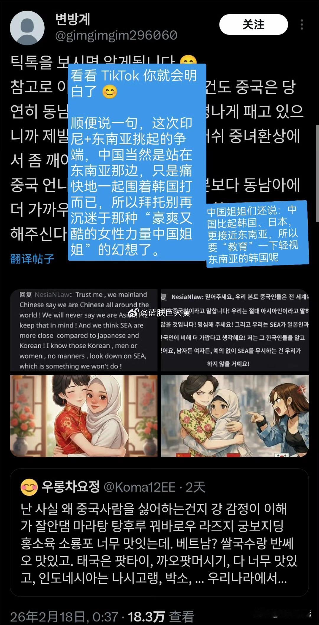 韩国东南亚网络大战,韩国人开始喷中国了,说泡菜和韩服是韩国的。 韩国和东南亚的网络骂战难得有清醒的韩女突然感慨: “很难理解为什么韩国人要讨厌中国?中国的麻辣烫、糖葫芦、锅包肉、等等都很好吃”, 还说越南、泰国、印尼也有很多好吃的, 而且还有很多人在韩国辛勤工作。 如果双方就这个善意发展下去,这场骂战可能就鸣金收兵了, 谁知道韩国网友根本不买账, 还把中国也扯进来,开始疯狂攻击中国。 转发区的韩国人突然就沸腾了…… 有人说这次骂战中国是占东南亚一边的,所以别再沉迷豪爽又酷的女性力量的中国姐姐幻想了。 有人说真正的韩国人是把对中国的厌恶刻在DNA里的。 还有人说“这些老是说韩国文化,比如泡菜和韩服,都是他们的,还说韩国原本是中国的。你怎么可能不讨厌他们?韩国人讨厌他们也是人之常情。” 还有拿出数字说“全世界最讨厌中国的国家就是韩国,81%的韩国人对中国持负面看法”。 还有更恶劣的都不想写出来! 只能说这个棒子国就是欠收拾。 韩国东南亚骂战 韩国人开始攻击中国
