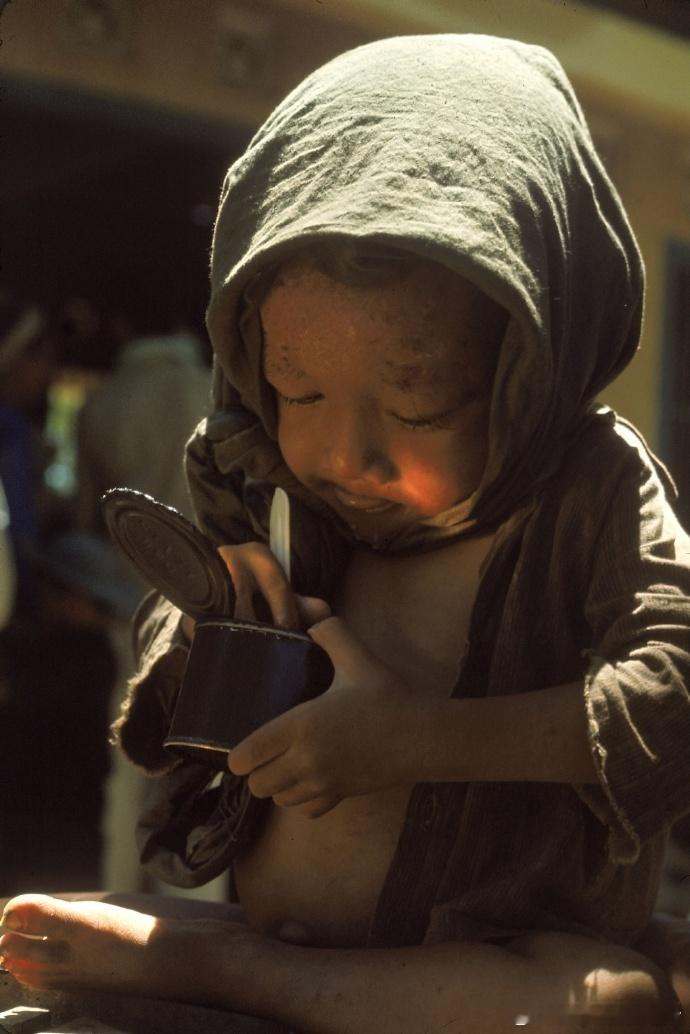 1965年,越南战争期间,一名营养不良的越南儿童在难民营吃一罐美国罐头。