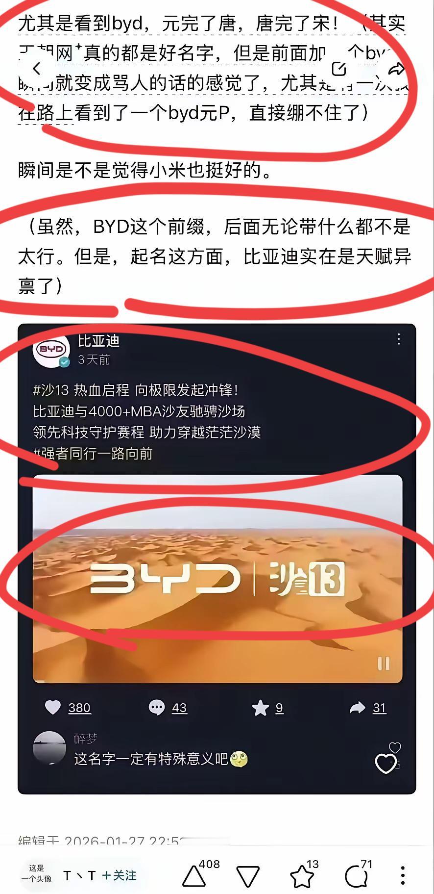 这个有点过了啊!! 总是拿别人的名义来调侃,还能有点新意吗? 都玩成梗了!! 有人说,他们取名天赋异禀,让人惊叹~ 最终还是要靠技术的嘛!新能源汽车的那些品牌,那些名字,那些系列,有几个好听的,不觉得! 而BYD已经成为了世界第一,还是玩这些烂梗就没意思了,没有BYD,可能你们买进口油车,合资油车还得加价!!知足吧,老铁,要看到我们的进步,不要总是灭自己威风,外国的月亮还是比中国圆么? 中国人,你要自信,老铁!