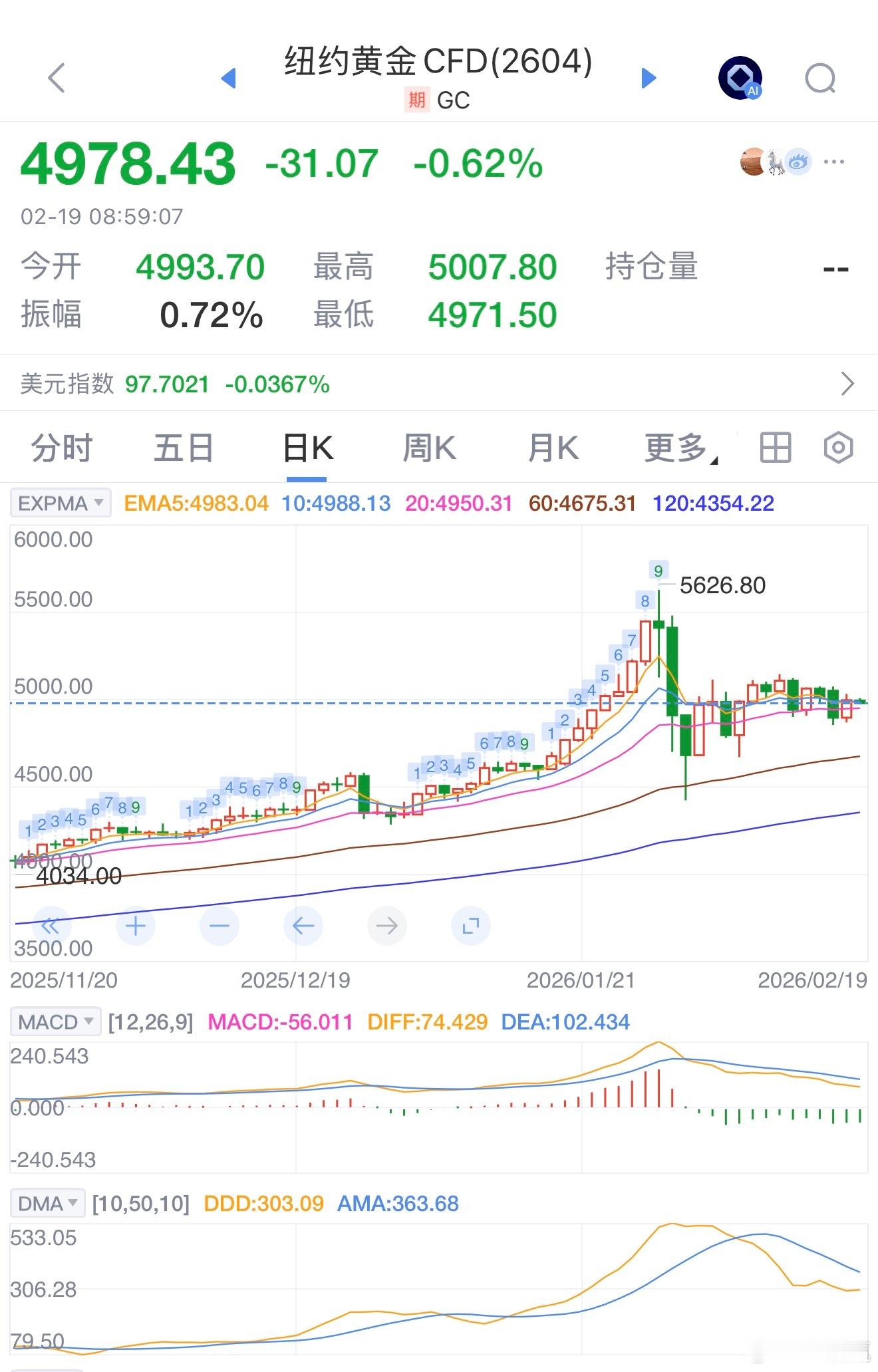 周三(2月18日)纽约尾盘,现货黄金涨2.08%,报4979.56美元/盎司,北京时间00:48曾涨至5010.90美元。COMEX黄金期货涨1.95%。现货白银涨5.04%,报77.2335美元/盎司,01:56曾达到78.3349美元。COMEX白银期货涨4.92%。COMEX铜期货涨2.40%,报5.8410美元/磅。现货铂金涨3.36%,现货钯金涨1.81%。(美股)费城金银指数收涨2.40%,原材料指数收涨1.24%,金属与矿业指数收涨1.38%。(全球时段)纽约证交所ARCA金矿开采商指数涨2.12%。金价
