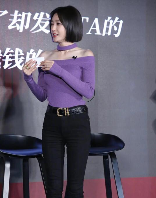 秦岚40+身材管理超棒,紫色一字肩上衣搭黑裤,性感又显温柔知性