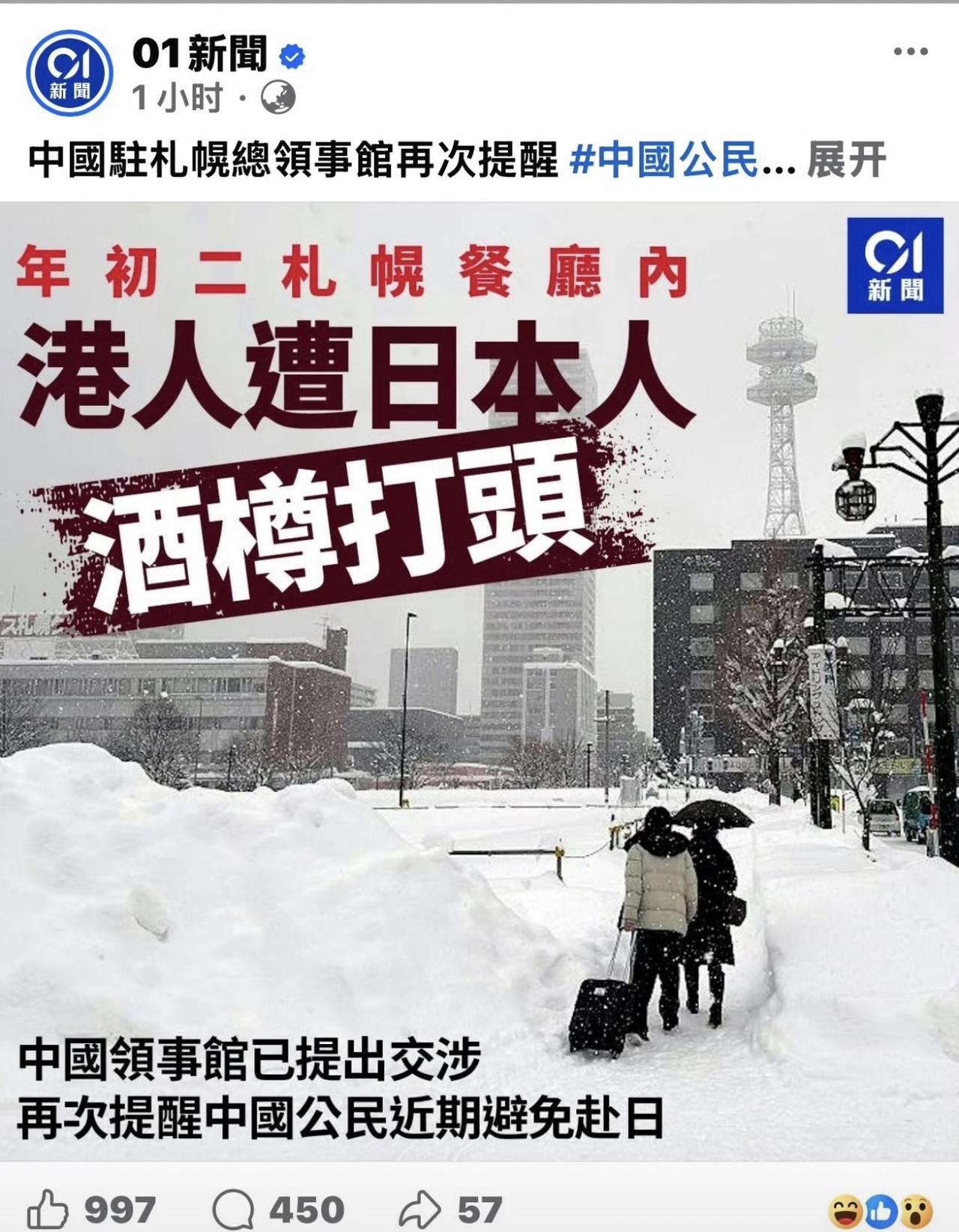 看到中国香港居民在日本北海道被打,被爆头!真的我很无语! 首先,国家左次三番的提醒近期不要去!就一定得去! 其次,部分香港大侄子水军在评论区不淡定了,疯狂洗地,说什么假新闻,什么新香港人,意思就是说是大陆的人,在日本说了普通话才被打!打着中文给日本人洗地,贬低大陆,请问这些人是跪着打字的吗?这些人要不要现在就去日本,出了事儿,别求救! 最后以后能不能别动不动就强调中国香港,中国台湾的……就一律中国人,不用搞特殊,他们多个毛啊,我们其他省份人出国都只说是中国人,不用刻意强调加省份![发怒][发怒][发怒]