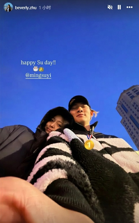 超甜!朱易发合照祝贺苏翊鸣夺金“Happy Su day!”,苏翊鸣社媒甜蜜回复“love you babe ”。