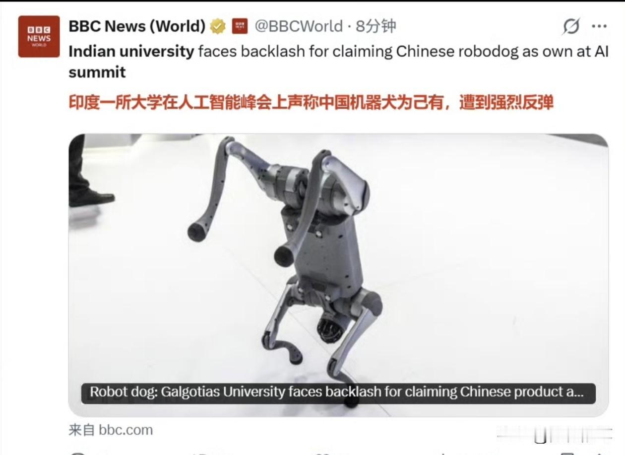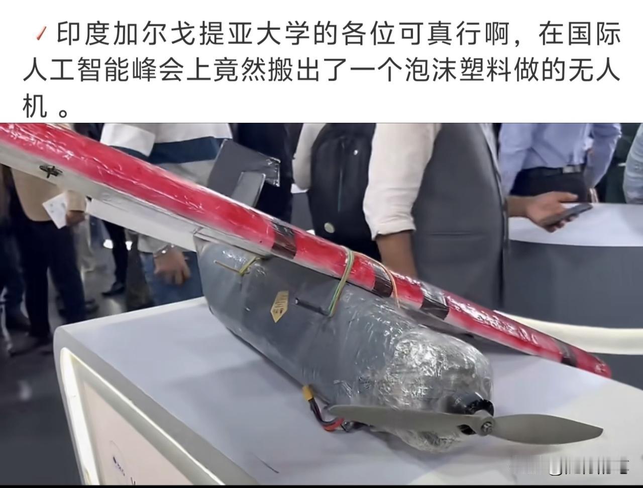 印度真的丢脸丢到国际上去了。 一连五天的印度人工智能(AI)影响力峰会,声称规模史上最大,本来印度的目的想通过这次峰会向世界展示印度在AI领域的成就,打响印度发展AI人工智能的名头,但是没想到却出现了两件丢人现眼的事情,一是有一家印度大学在展厅展出一个机器狗,声称是自研和印度制造的,结果却被识穿居然是中国宇树科技的机器狗,这件事目前已经被西方媒体广泛报道,引起群嘲。另外一件事情更加离谱,印度加尔戈提亚大学居然敢搬出一个泡沫塑料做的无人机模型放在展览厅提供展览,坦白说这个手工搓出来的无人机放在大学里面做教学用都不合格,没想到它居然自信满满的放在一个国际人工智能峰会上,这不是足够自信的问题,这是没有认知,把AI当儿戏的问题,浪费该活动的公共资源的问题,而且这么多国际AI专业人士看到,国际媒体看到,印度这些人真的脸皮够厚,丢人也要丢个大的。 印度虽然在AI人工智能领域不是主要角色,但是也没想到作为一个想在该领域展示雄心勃勃的大国,居然会出现如此令人啼笑皆非的情况,人工智能成绩的名声没有打响,笑话可是闹了全世界都知道了,只能说印度想在AI领域有所作为,还任重道远。