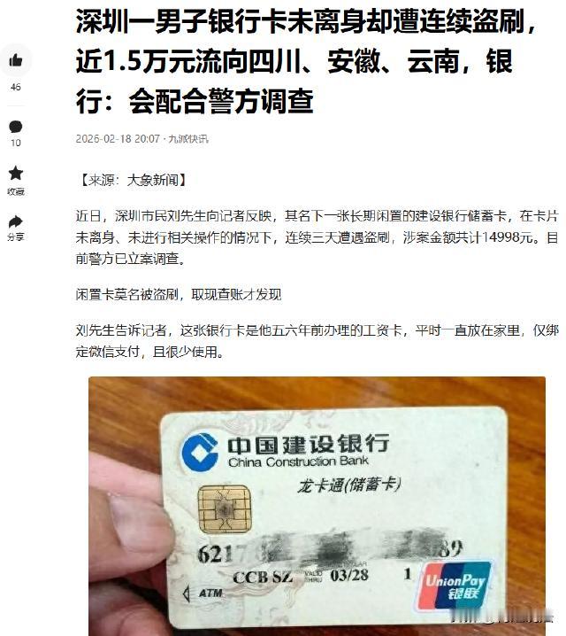 深圳,刘先生五六年前办了张建行工资卡,绑定了微信,平时就留点小钱日常用。朋友还钱后卡里多了1.5万多,他没及时转走。结果某天转账时发现钱没了,只剩了410.38元。一查流水,钱在三天内分三笔被盗刷,流向四川、安徽、云南三地。刘先生赶紧报了警,立案侦查后,安徽冻结了部分资金,昆明也关停了涉事公司的POS机,四川资金却没有线索。刘先生觉得银行该承担责任,银行称:一直在核查。 本新闻来源于:大象新闻、九派快讯、 这事,还得从五六年前说起。 那时,刘先生办了张建行的工资卡,顺手就绑在了微信上,平时卡里就留点小钱,够日常开销就行。 后来有朋友还钱,卡里一下子多了1.5万多块钱。刘先生想着反正暂时也用不着,就没急着转走,谁能想到,这钱后来没有了! 1月31日,刘先生打算给老家的父母转点生活费,结果手机提示余额不足。他当时就愣住了,卡一直揣在自己兜里,也没进行什么大额消费,这钱怎么就没了呢? 刘先生赶紧查了查流水,这一查可不得了,1月23号到25号这三天里,卡里的钱被分三笔给盗刷了,分别流向了四川、安徽、云南三地,最后卡里就剩410.38元了。 这钱,就这么不明不白地没了,刘先生赶紧报了警,立案后,民警开始着手调查这事。 安徽那边动作挺快,冻结了一部分资金,昆明也关停了涉事公司的POS机,可四川那边却一直没找到什么线索。 刘先生觉得银行得负点责任,毕竟这钱是存在银行里的,银行有义务保障客户的资金安全。可银行那边却说一直在核查,也没给个明确的说法。 这事搁谁身上都郁闷得很,把钱存银行,不就是图个安全、放心嘛。可现在倒好,钱没了,银行还一副事不关己的样子,这谁能受得了哈? 刘先生的卡一直在身边,也没泄露密码啥的,这钱怎么就被盗刷了呢? 现在盗刷的手段可多了,有些不法分子会通过伪造银行卡、窃取银行卡信息等方式来盗刷钱财。他们可能是在刘先生刷卡消费的时候,偷偷记录下了银行卡的信息,然后复制一张假卡,再进行的盗刷。 不过,话说回来,就算是不法分子盗刷了钱,银行就真的没责任了吗? 其实,银行对客户的资金安全是有保障义务的。根据《商业银行法》的规定,商业银行应当保障存款人的合法权益不受任何单位和个人的侵犯。这包括要采取必要的安全措施,防止客户的资金被盗刷、被诈骗等。 刘先生的钱被盗刷了,银行有没有尽到安全保障义务呢? 这还真得看具体情况。如果银行在技术上、管理上存在漏洞,导致客户的资金被盗刷,那银行肯定得承担一定的责任。 如果银行已经尽到了安全保障义务,是因为客户自身的原因导致资金被盗刷的,那银行可能就不用赔了。 如果是客户自己把密码泄露了,或者把银行卡借给了别人使用,这些情况下银行就不用承担责任。 不过,刘先生可是什么都没干,卡一直在身边,密码也没泄露。那银行是不是就得赔钱了呢? 其实,这还得看警方能不能找到盗刷的人,以及能不能证明银行存在过错。如果能找到盗刷的人,并且证明银行在技术上、管理上存在漏洞,导致客户的资金被盗刷,那银行肯定得赔钱。 可现在的问题是,四川那边的资金还没找到线索,警方也没法确定盗刷的人是谁。这样一来,刘先生想要银行赔钱,可能就有点难了。 不过,刘先生也别太着急,毕竟警方还在调查,说不定哪天就找到线索了。 刘先生的钱,就这么没了,换谁都得心疼。银行虽然一直在核查,可也没给个明确的说法,这让人心里挺没底的。 银行在处理这类案件的时候,应该更积极一些,如果银行总是这么敷衍了事,那以后谁还敢把钱存银行呢? 银行在这起案件中应该承担责任吗?如果银行不赔钱,刘先生又该怎么办呢?欢迎大家在评论区留言讨论,一起聊聊这事!