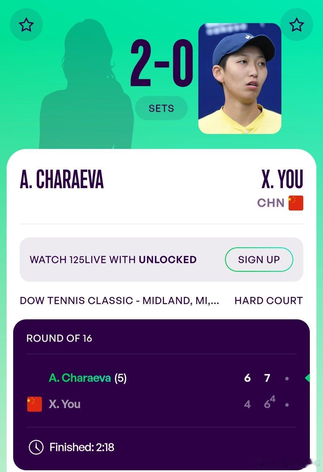尤晓迪🇨🇳4-6/6-7(4)不敌查拉耶娃🇷🇺,无缘晋级8强。