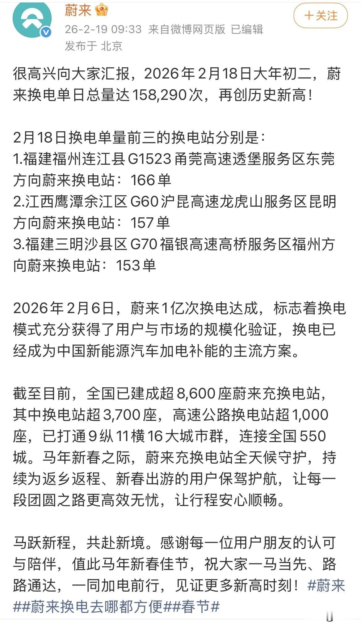 李斌:高兴向大家汇报,蔚来换电单日总量达158,290次! 今天是大年初三 ,在社交网络向大家汇报他们昨天达成的一个新成绩,仅仅昨天一天,蔚来换电的总量就到了,差一点16万次! 就在刚才,要知道,前段时间他们刚刚破了一个亿的换电次数,现在春节期间出行的用户明显比较多多了,每一天能够达到接近16万的换电次数,在一定程度上说明蔚来用户的规模在不断地扩大,大家已经习惯了这种换电的模式。 不知道他们是怎么做到的,因为这背后也就就意味着至少有差不多16万块电池被换下来装上去,这么多换电站,如此高频率的换电,是对他们的前期基础投入,以及后期养护人员的综合考验,目前看来这个考验正在顺利地通过。 只要换电站足够的多,这种模式的便捷处会不断地凸显出来,看来今年李斌可能还会在这方面的基础设施继续投入,但目前他应该不慌了,毕竟他们从去年第四季度开始,已经正式的盈利了。