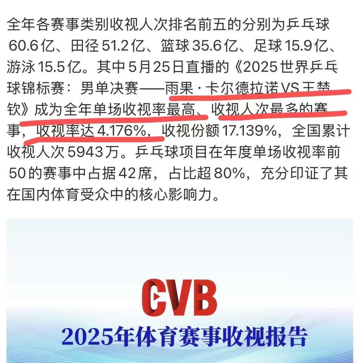 2025体育赛事收视率报告:世乒赛男单决赛王楚钦VS雨果成为单场收视率最高! 体育赛事收视率报告显示, 乒乓球🏓赛事的关注度最高, 其中去年的多哈世乒赛 男单决赛, 王楚钦VS雨果的单场比赛 收视人次最高! 原来这么多人一起见证了 王楚钦的夺冠时刻! 因为球迷都想见证王楚钦夺冠的 历史时刻! 王楚钦真威武, 不负众望, 能见证王楚钦夺得世乒赛单打冠军 这一历史时刻, 真的很开心, 从那时候开始, 王楚钦越来越自信, 越来越坚定, 新加坡大满贯, 王楚钦加油!