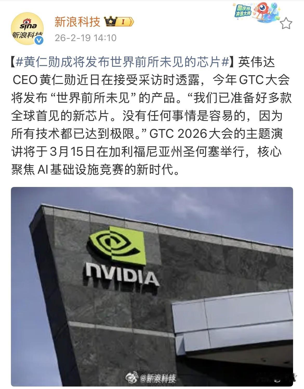 黄仁勋成将发布世界前所未见的芯片! 就在刚才新浪科技放出了这条消息,3月15号