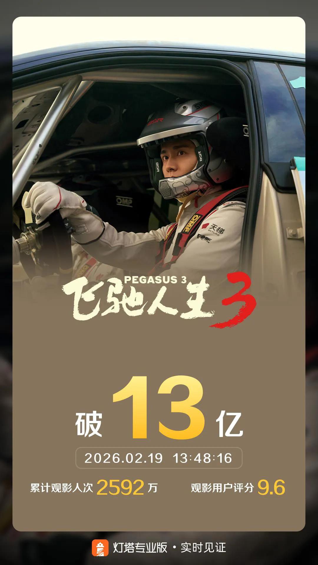 《飞驰人生3》票房破13亿,尹正成为110亿票房男主演。 由韩寒执导,沈腾、尹正、黄景瑜、张本煜领衔主演,魏翔、沙溢、范丞丞、孙艺洲主演,段奕宏特邀主演,张新成、胡先煦、李治廷、白宇帆、周政杰、高华阳特别出演,贾冰、王安宇、陈永胜、冯绍峰、郝瀚友情出演的2026春节档热血赛车题材喜剧电影《飞驰人生3》累计综合票房破13亿,超越《年会不能停!》、《捕风捉影》等片,进入内地影史票房总榜87强;超越《西游降魔篇》,进入春节档历史24强。 随着《飞驰人生3》的热映,不仅沈腾继续稳固了内地影史票房第1男主演的身份,尹正主演电影累计票房也突破了110亿。尹正作为《飞驰人生》系列的全勤主演,是该系列不可或缺的一个角色。电影飞驰人生3 2026春节档