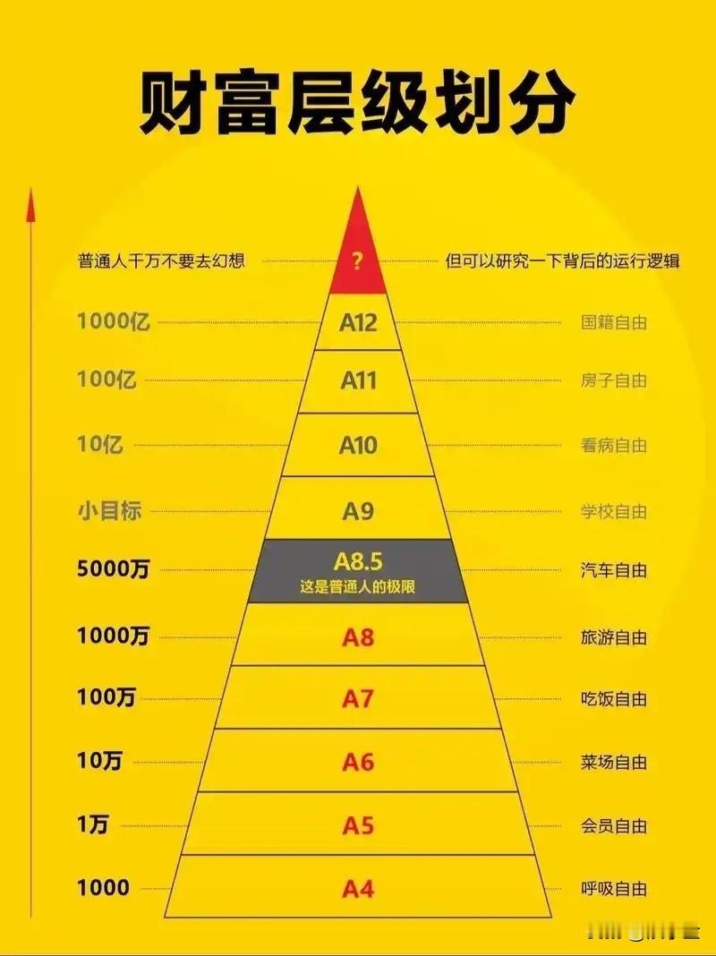 学到了,原来财富等级划分是这样的? 金融圈是这样评判财富标准的!你的财富等级标准,A1到A9代表你的资产从1位数到9位数! 资产等级为:“Ax.y",X:代表资产数值的位数! y;:代表首位数字;A:代表Asset,即资产、财产! 具体是这样的! A4:总资产约为1000左右! A5级别:总资产约为10000左右! A6级别:总资产约为10W左右。 A6.5级别:总资产约为50W左右。 A7级别:总资产约为100W左右。 A7.5级别:总资产约为500W左右。 A8级别:总资产约为1000W左右。 A8.5级别:总资产约为5000W左右。 A9级别:总资产约为1个太阳。 A10级别:总资产约为10个太阳。 A11级别:总资产约为100个太阳。