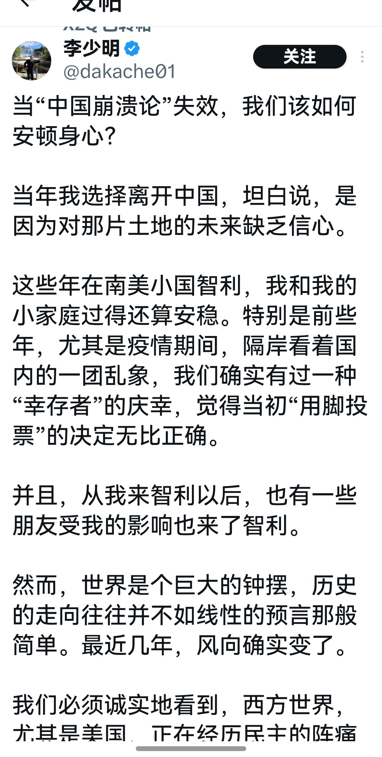转发一篇,即使移民智利了,仍然能对中国崛起保有高高在上的诚意,这也是一种来自海外的安魂曲,思维能力真是超级强大,但这辈子也就这样了,原文如下: 【当“中国崩溃论”失效,我们该如何安顿身心?】 当年我选择离开中国,坦白说,是因为对那片土地的未来缺乏信心。 这些年在南美小国智利,我和我的小家庭过得还算安稳。特别是前些年,尤其是疫情期间,隔岸看着国内的一团乱象,我们确实有过一种“幸存者”的庆幸,觉得当初“用脚投票”的决定无比正确。 并且,从我来智利以后,也有一些朋友受我的影响也来了智利。 然而,世界是个巨大的钟摆,历史的走向往往并不如线性的预言那般简单。最近几年,风向确实变了。 我们必须诚实地看到,西方世界,尤其是美国,正在经历民主的阵痛与回潮,政治极化、社会撕裂和人权记录的瑕疵不容忽视。 与此同时,中国在几个关键领域——无论是新能源产业链的爆发、基建的狂飙突进,还是在国际地缘政治中长袖善舞——确实取得了令世界侧目的进展。经济体量的庞大和国际话语权的提升,是无法否认的客观事实。 这种“东升西降”的直观感受,让海外华人圈出现了一种微妙且剧烈的情绪撕裂。 我注意到,有一批当年因为反共、或笃信“中国崩溃论”而出国的人,陷入了某种无法接受的焦虑。 也有一些曾经靠贩卖焦虑、诱导国内中产恐慌性移民的所谓“公知”或中介,渐渐变得如坐针毡。 在他们的逻辑闭环里,只有中国变得越来越差,民不聊生,才能证明他们当年离开的“英明”,才能支撑他们在异国他乡或许并不如意的生活。 一旦中国表现出韧性与进步,没有如他们所愿地“崩溃”,他们的心理防线就崩塌了,产生了一种剧烈的认知失调。他们愤怒、否认。 他们在意中国的每一个负面新闻,仿佛只有依靠故土的苦难,才能展现自己生活的优越感。 但我并不认同这种心态。 首先,我承认中国在经济领域的硬实力,承认国家机器在调动资源上的惊人效率。否认这些,就是否认现实,就是自欺欺人。 但是,我们更要看到这种“强大”背后的代价。中国模式的崛起,在很大程度上是建立在对人口红利的极致挖掘、对劳动者权益的长期忽视以及对社会再分配的压抑之上的。那种宏大的国家叙事,往往是以无数个体的沉默为燃料的。 作为一个普通人,我关注的不仅仅是国家造出了多少艘航母,而是快递小哥有没有社保,是维权律师能不能说话,是普通人在面对公权力时能不能抬起头。 其次,不要被“西方的噪音”吓倒。 很多人看到美国的混乱就觉得西方民主“药丸”。但是要知道民主制度的特点本来就是“喧闹”的。这种噪音,往往是社会肌体在排毒、在纠错的过程。 相比之下,威权体制的“静悄悄”虽然高效,但往往掩盖了内部积累的脆性风险。 噪音不代表衰退,沉默也不代表健康。 我们选择离开,本质上是选择了一种即使有噪音、有混乱,但依然拥有自我修复能力和表达权利的生活方式。 某些心态失衡的人,深层恐惧可能源于“后路的断绝”。当中国变得强大且意识形态更加收紧,他们意识到自己可能永远无法以一种体面的姿态回去了。 但我早已想通,既然选择了离开,故乡就是回不去的远方。我不需要那个远方变得贫瘠来安慰我,我只希望它的人民能过得好。 在我看来,现在的中国依然是一个“跛脚的巨人”。物质的繁荣掩盖不了人权纪录的不良,宏大的叙事替代不了个体对尊严的渴望。 无论高楼大厦建得再高,如果普通公民的宪法权利依然没有保障,如果言论的自由依然处于严苛的审查之下,如果人民的尊严需要随时为“大局”让路,那么这种繁荣对我而言,依然缺乏最核心的吸引力。 我离开,不是因为我觉得它造不出芯片或飞船,而是因为我希望我的孩子生活在一个不需要为了生存而时刻让渡权利的环境里。 那些因为中国经济变好而感到愤怒的人,或许是因为他们把出国的意义仅仅锚定在了“逃离”上,而对于像我这种追求“免于恐惧的自由”的人来说,中国的经济起飞和我们在海外追求的普世价值,本来就不是零和博弈。 中国好,我祝福,因为那里有我的亲人朋友同学老乡,我希望他们能分享到发展的红利。 我依然会选择留在这里,拥抱有瑕疵的民主、以及能让我挺直腰杆呼吸的自由。 我相信这样一种心安,是每一个成年人应有的体面。