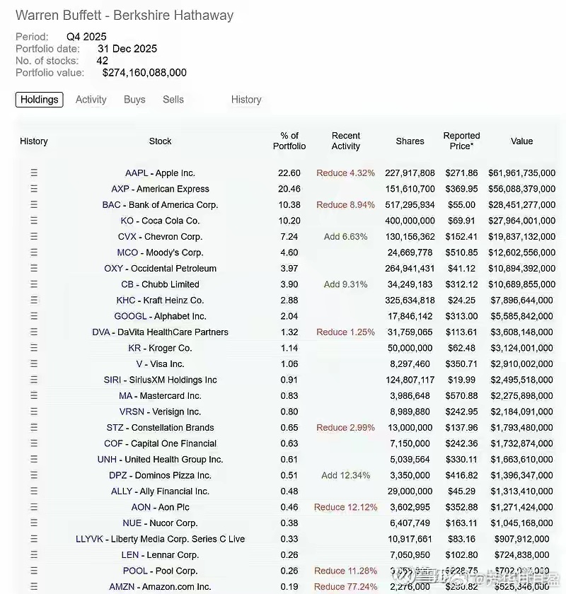 伯克希尔2025年Q4持仓出炉,苹果继续稳居第一重仓,但有小幅减持;亚马逊近乎清仓,科技股持仓格局显著分化。此前网传“伯克希尔清仓谷歌”纯属假新闻,官方13F文件显示,谷歌持仓纹丝不动、一股未减,足见对其AI与云业务长期潜力的认可。同期伯克希尔增持能源、减持金融、坚守消费龙头。