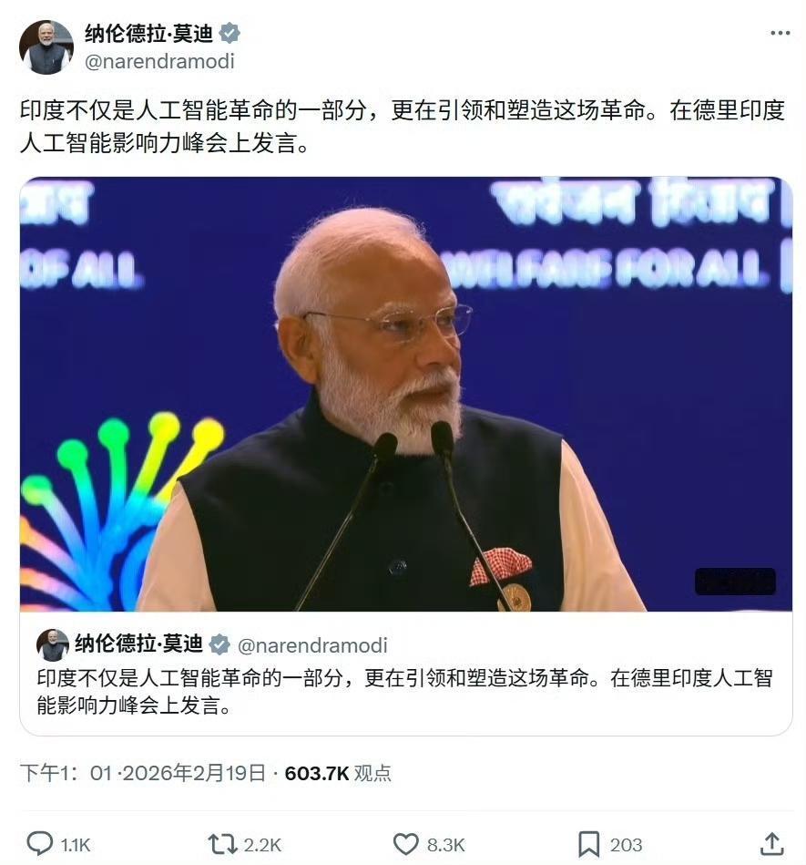 可真会自夸!印度总理莫迪在人工智能峰会讲话:印度在引领和塑造人工智能革命。 印度总理莫迪在2026年新德里人工智能影响力峰会上宣称印度正在引领和塑造人工智能革命,提出印度要成为全球前三的AI创新超级大国。政府设定了未来两年吸引2000亿美元AI投资的目标,并推动本土AI生态建设。然而,峰会实际组织混乱,首日即因安检失控、展台被盗、设备丢失等问题遭广泛批评,甚至有参展方被曝展示采购自中国的机器狗却谎称自主研发,引发诚信争议。尽管高调邀请多国政要与科技巨头,现场管理不善、支付方式落后、议程不清等问题暴露了落地执行能力的短板。莫迪的宏大叙事与现实落差形成鲜明对比,凸显其AI雄心仍面临基础瓶颈