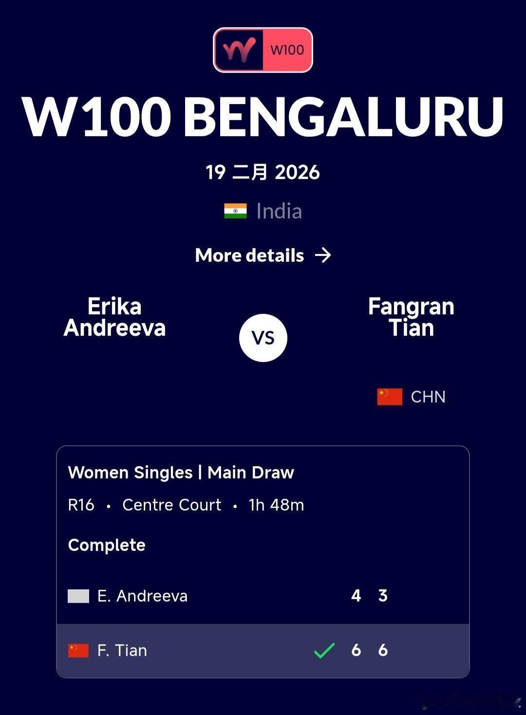 最新赛事赛程2月19日14:30左右 W100班加罗尔站女单第2轮田方然🇨?