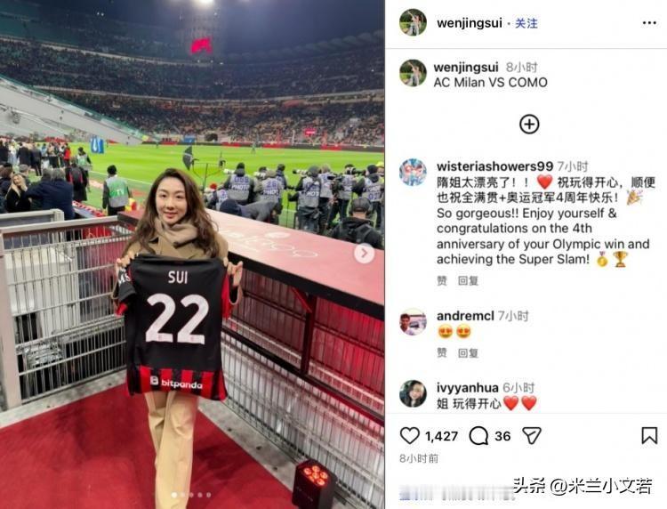 隋文静造访圣西罗。著名花滑名将隋文静在圣西罗体育馆手持22号球衣亮相,估计是我卡的粉丝,我卡巅峰时期无论是颜值还是球技都是顶级的,我卡雨夜斩曼联,一晃已过20年。 前段时间吴彦祖也造访过圣西罗,之前还有乒乓球的那个叫啥马龙?是这个名字吗,我们国家名人去圣西罗的相对于欧洲少一些,但这次有美女造访,真的是很少见。 隋文静推特上说的是终于来到了圣西罗球场。很多球迷留言表达自己也是看米兰球长大的,我不清楚这个隋文静在自己的领域到底啥水平,但他与球迷互动说话十分谦逊,这样谦逊的人相信无论做什么都会有所建树,这素质一看就是米兰球迷。