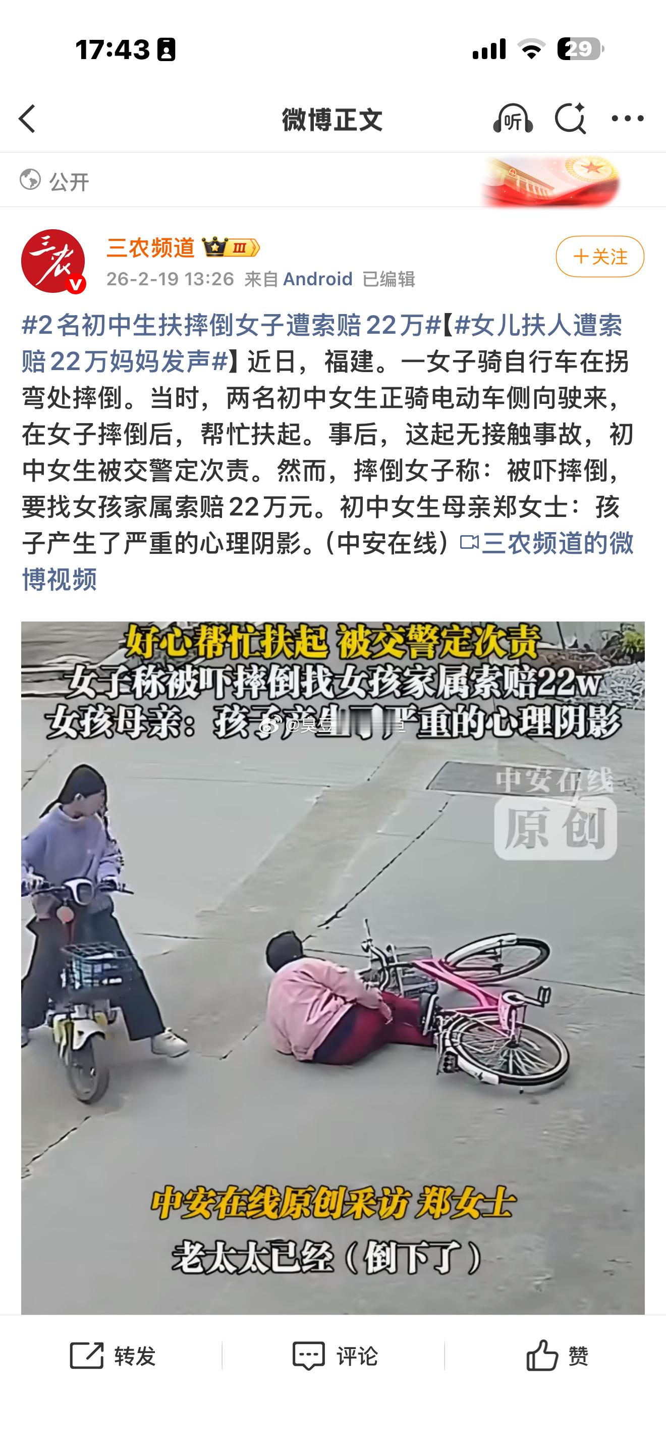 2名初中生扶摔倒女子遭索赔22万扶不扶的含金量,再一次证实