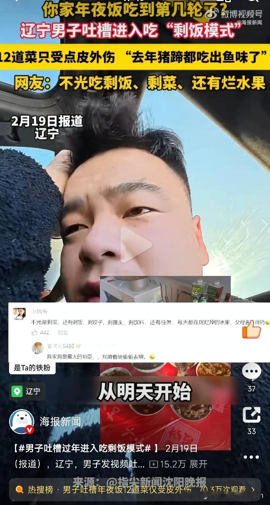 春节变剩饭模式! 辽宁男子吐槽12道年夜饭吃出“鱼味” 大年初三了,打开冰箱又是满眼的剩菜剩饭,真是让人哭笑不得! 辽宁一男子发视频吐槽:“过年做12道菜,结果吃到现在还剩一大半!去年猪蹄都吃出鱼味了,今年估计得成‘古董菜’!” 评论区瞬间炸锅,网友纷纷表示:“我家也一样!不光剩饭剩菜,还有烂水果,现在进入‘有啥吃啥’模式,愁死了!” 看看这春节的剩饭循环,简直像极了“大型生存挑战”: 1️⃣ 年夜饭盛况:鸡鸭鱼肉堆成山,盘盘都冒尖,生怕不够吃,结果——根本吃不完! 2️⃣ 冰箱惨状:剩菜挤满冰箱,层层叠叠像“剩菜塔”,热一遍又一遍,味道越来越“迷”…… 3️⃣ 肠胃抗议:明知隔夜菜不健康,但长辈总说“倒了浪费”,硬着头皮往下咽,肠胃:我真的会谢! 4️⃣ 心理阴影:去年吃剩的猪蹄今年“返场”,尝一口——居然吃出了鱼味儿?这波“剩宴”太酸爽! 网友神评论亮了: “我家十口人吃年夜饭,菜只受点皮外伤!” “从除夕吃到初七,剩菜比春晚重播次数还多!” “现在看到红烧肉就想吐,求心理阴影面积……” “建议年夜饭改‘自助模式’,吃多少拿多少,拒绝浪费!” 说真的,老一辈总觉得“剩菜是年味”“年年有余得靠剩”,但咱们年轻人心里苦啊:剩菜反复热,营养流失还伤身,钱包和肠胃都在滴血!而且,这哪是“有余”,简直是“肠胃耐受度大挑战”! 明年年夜饭flag立起来: ✅ 少做点,精致不铺张! ✅ 吃多少做多少,拒绝“剩宴”! ✅ 剩菜科学处理:该冻冻,该分分,别让辛苦准备的饭菜最后变成“垃圾桶VIP”! (文章素材来自海报新闻,侵删)