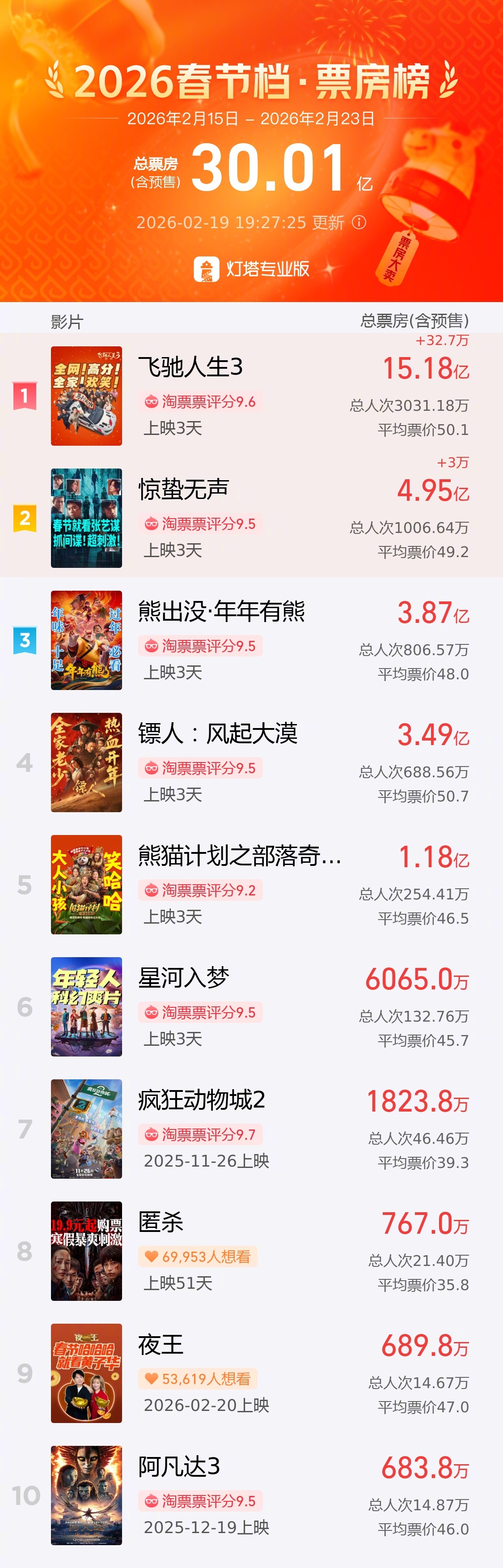 2026春节档总票房破30亿 据灯塔专业版,截至2月19日19时27分,2026春节档(2月15日-2月23日)档期总票房(含预售)突破30亿。春节档马上有戏