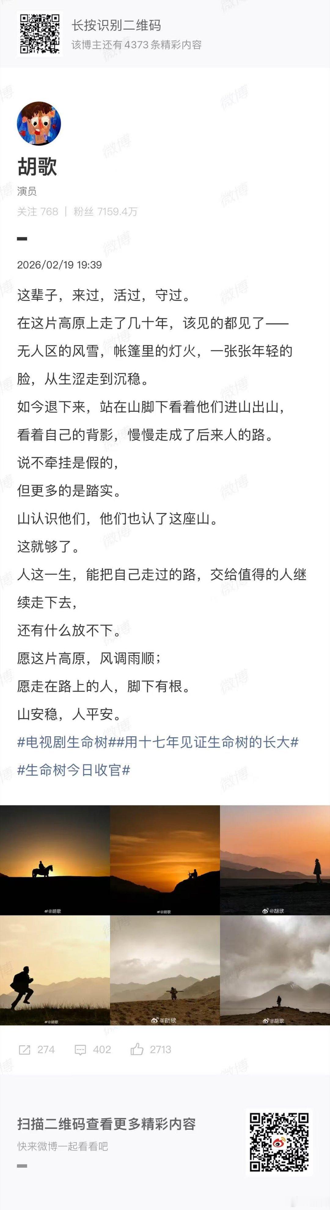 胡歌发文告别生命树胡歌发文告别《生命树》多杰“人这一生,能把自己走过的路,交给值得的人继续走下去,愿这片高原,风调雨顺;愿走在路上的人,脚下有根。”再见多杰,再见高原守护者。胡歌以赤诚演绎生命重量,用一生守护山河生灵。故事收官,敬意不止,致敬每一份无声坚守。新娱